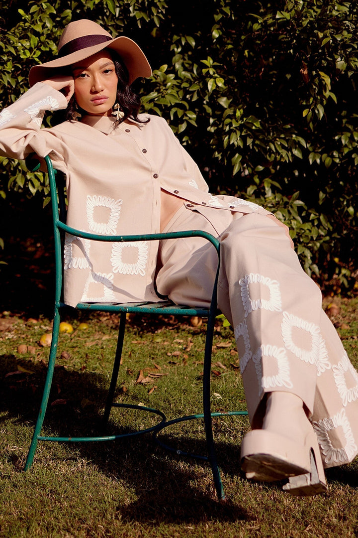 Beige Cotton Linen Embroidery Quad Swirl Cora Shirt With Trouser For Women