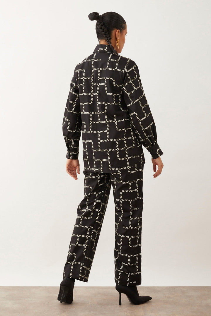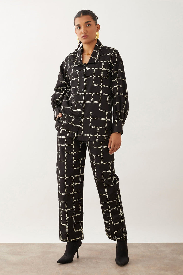 Black Premium Cotton Satin Printed Chevron Chelsea Kiki Trouser Set For Women