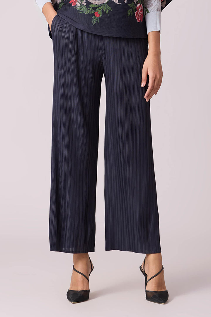 Powder blue, black pleated top with art deco floral print. Paired with pleated straight pant.
