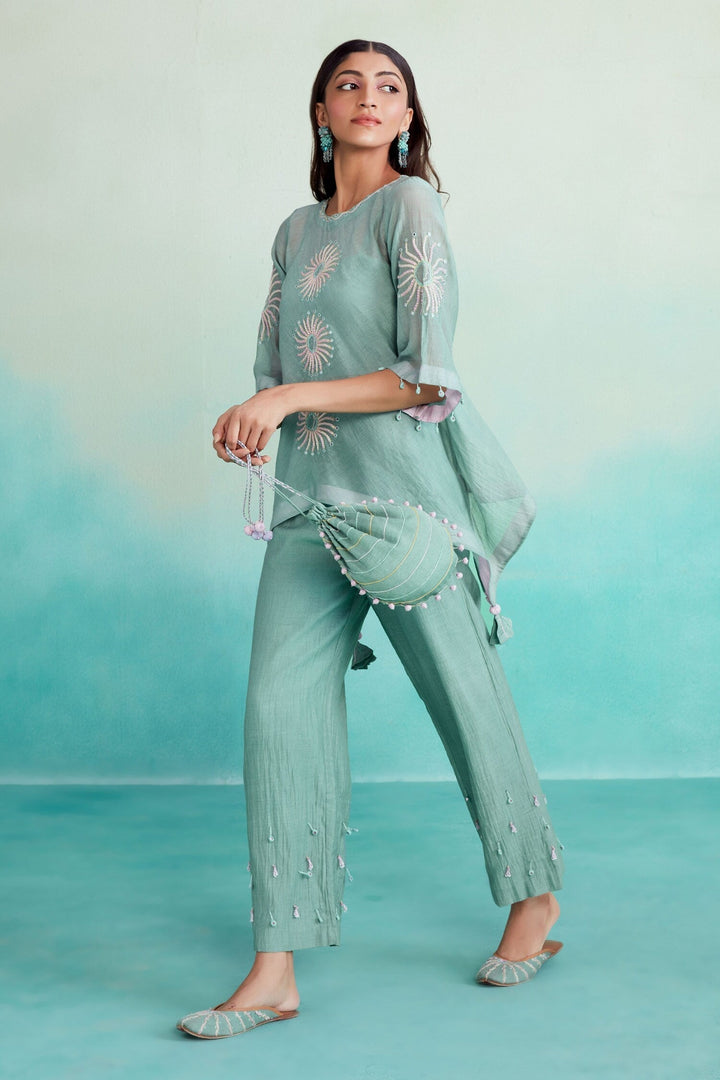 Mint top in lightweight flowy chanderi fabric with sun motifs hand-embroidered using cording technique. Comes with straight-cut trousers featuring handmade hangings at the bottom.