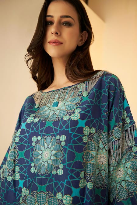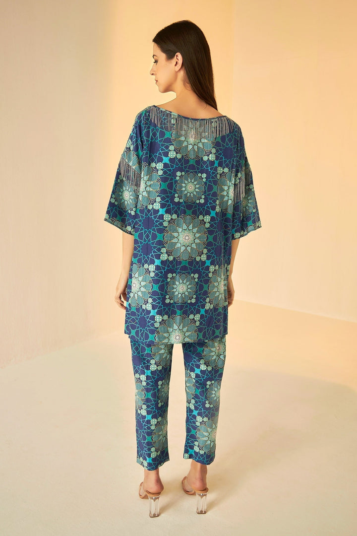 Blue three quarter sleeve top made in cotton silk base, accentuated with all over flower mandala print and chain hangings along the neckline and sleeves. Paired with a coordinating pant.