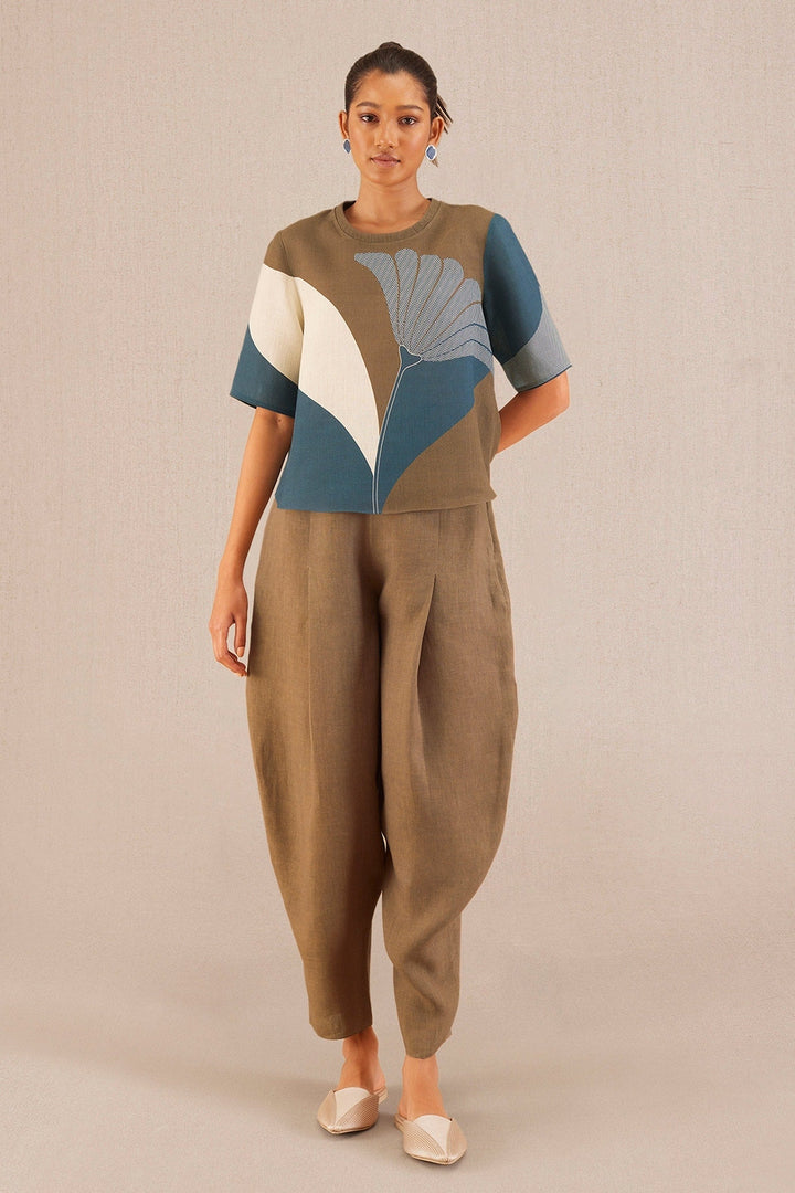 Slate blue and taupe floral pattern flowy top with fluid patterns. Comes with plain taupe dhoti pant.