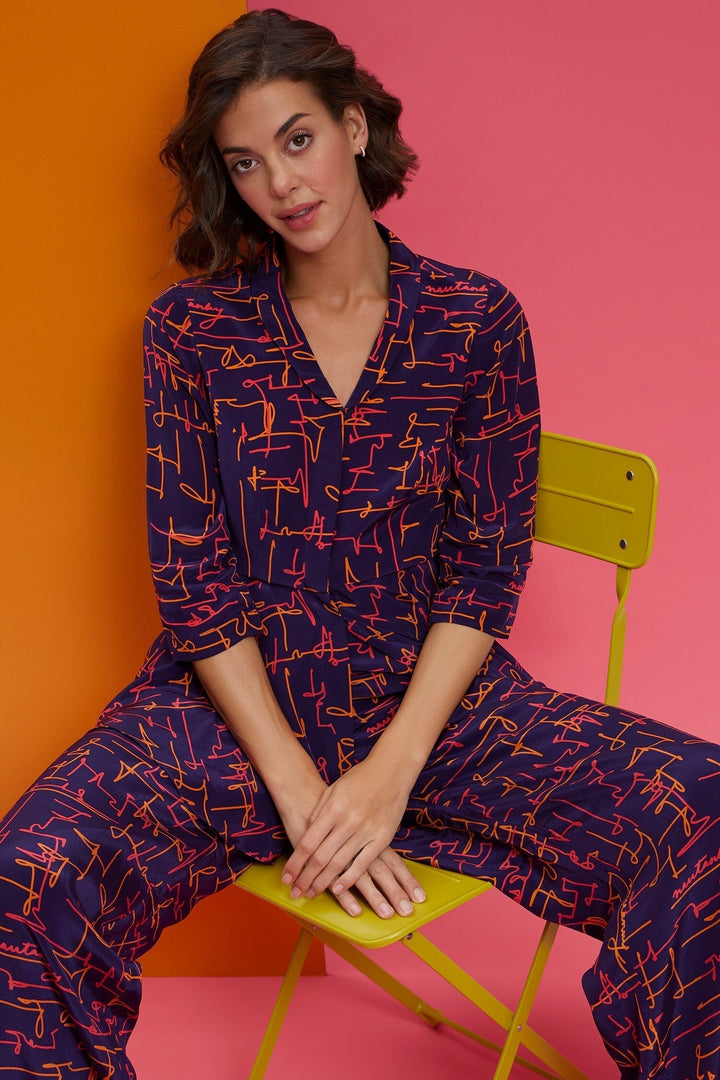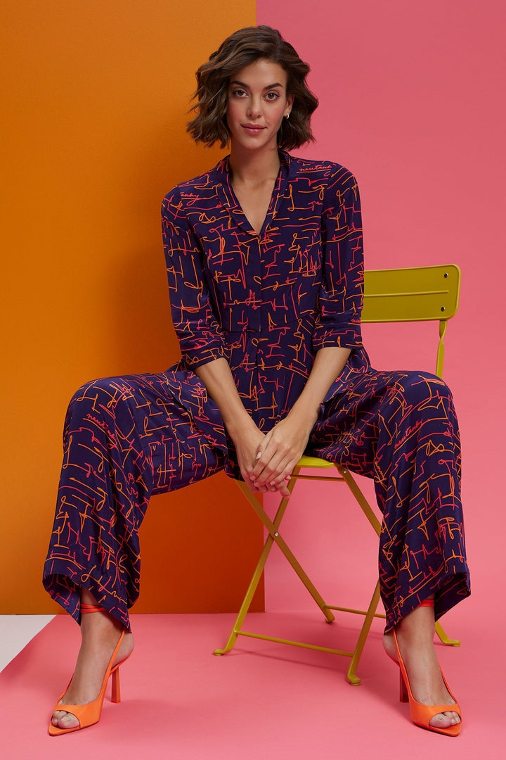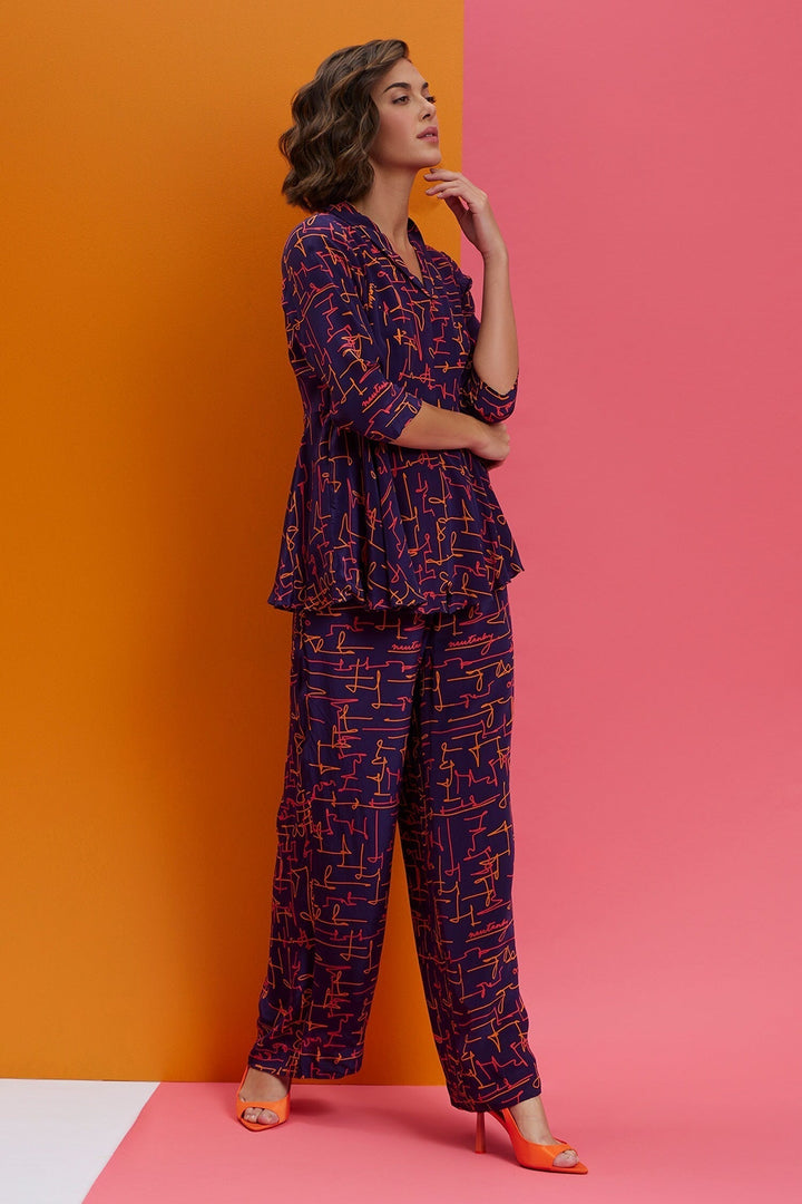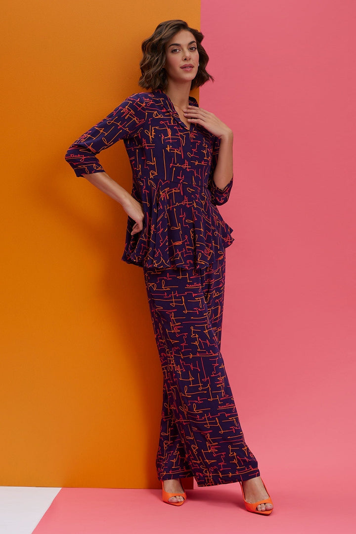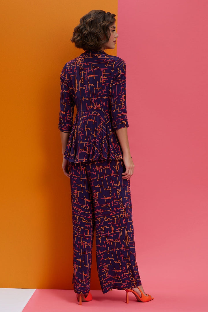 Navy blue natural crepe peplum top with abstract print. Comes with pant.