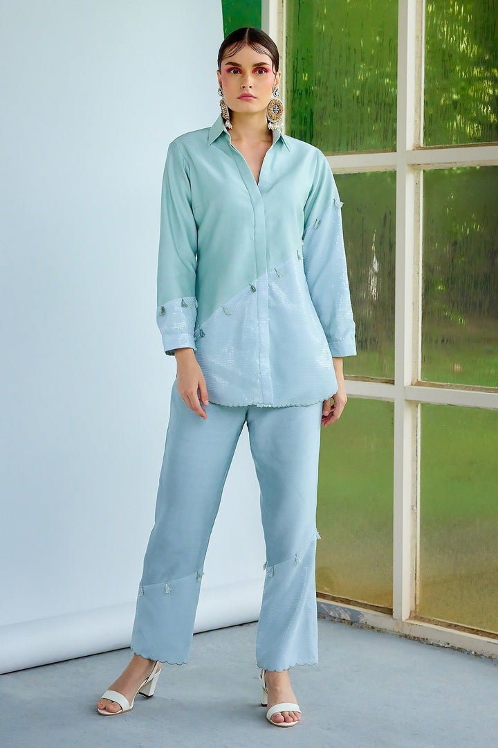 Blue Pure Silk Chanderi Renne Solid Shirt And Pant Set