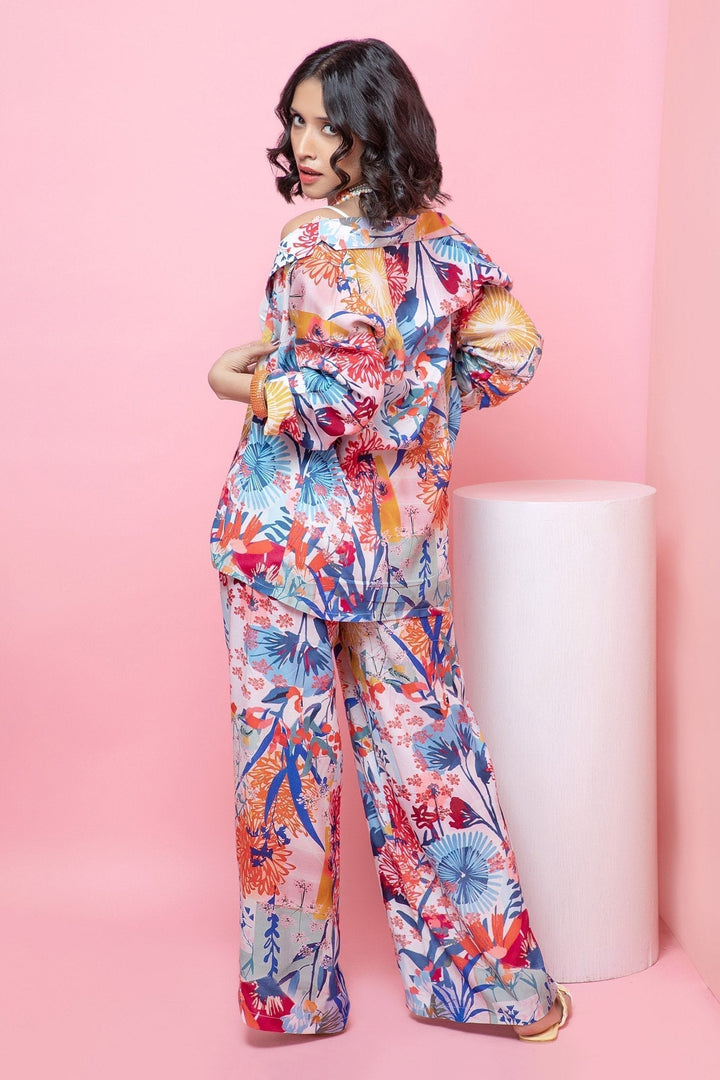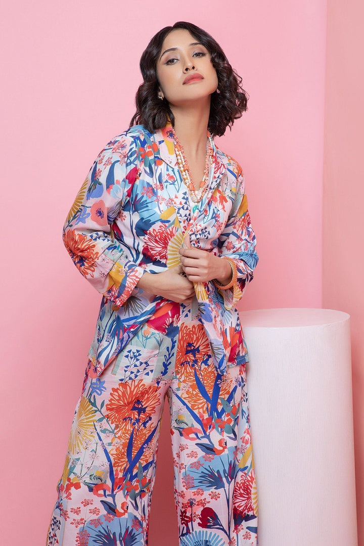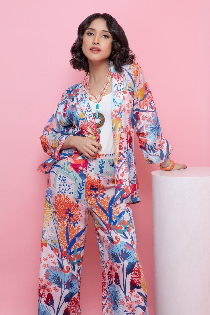 Blue Rayon Blooming Flower Print Blazer Shirt And Pant Co-ord Set
