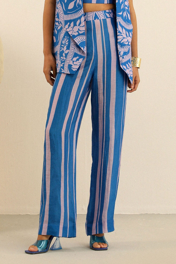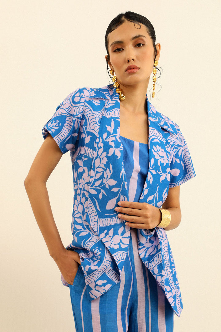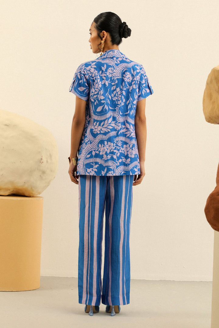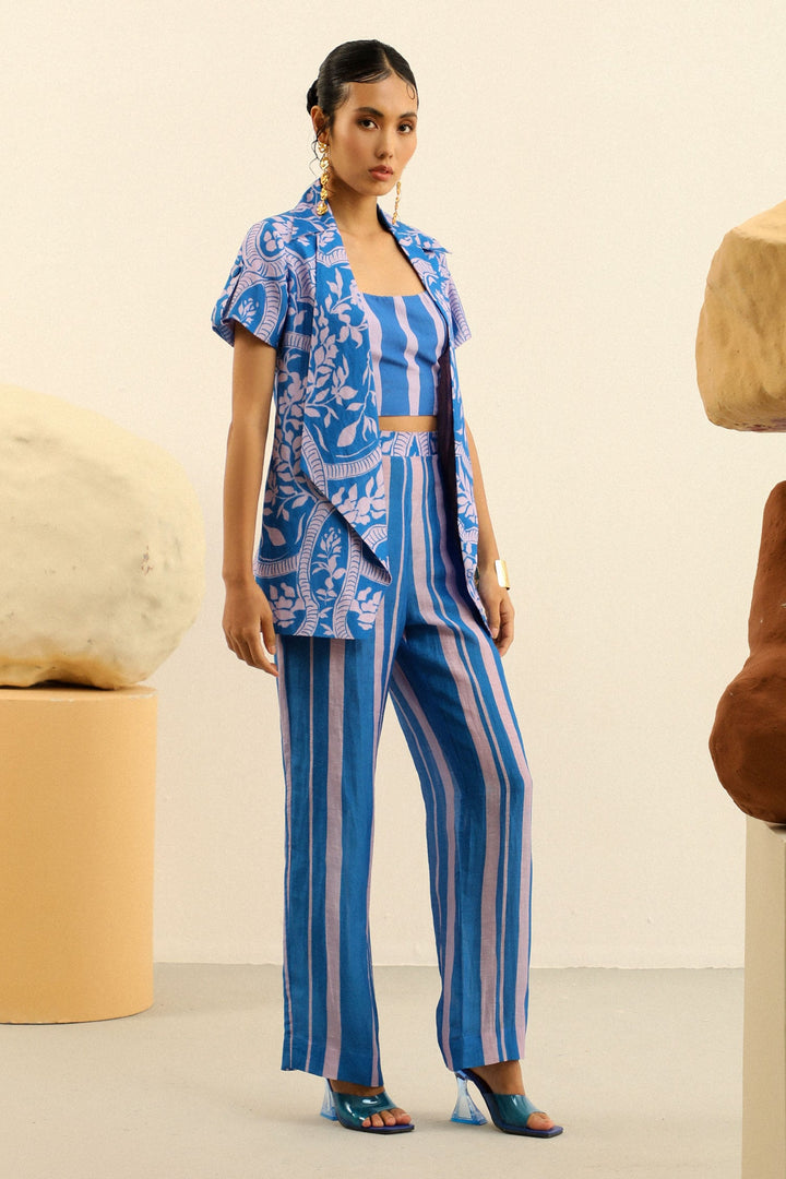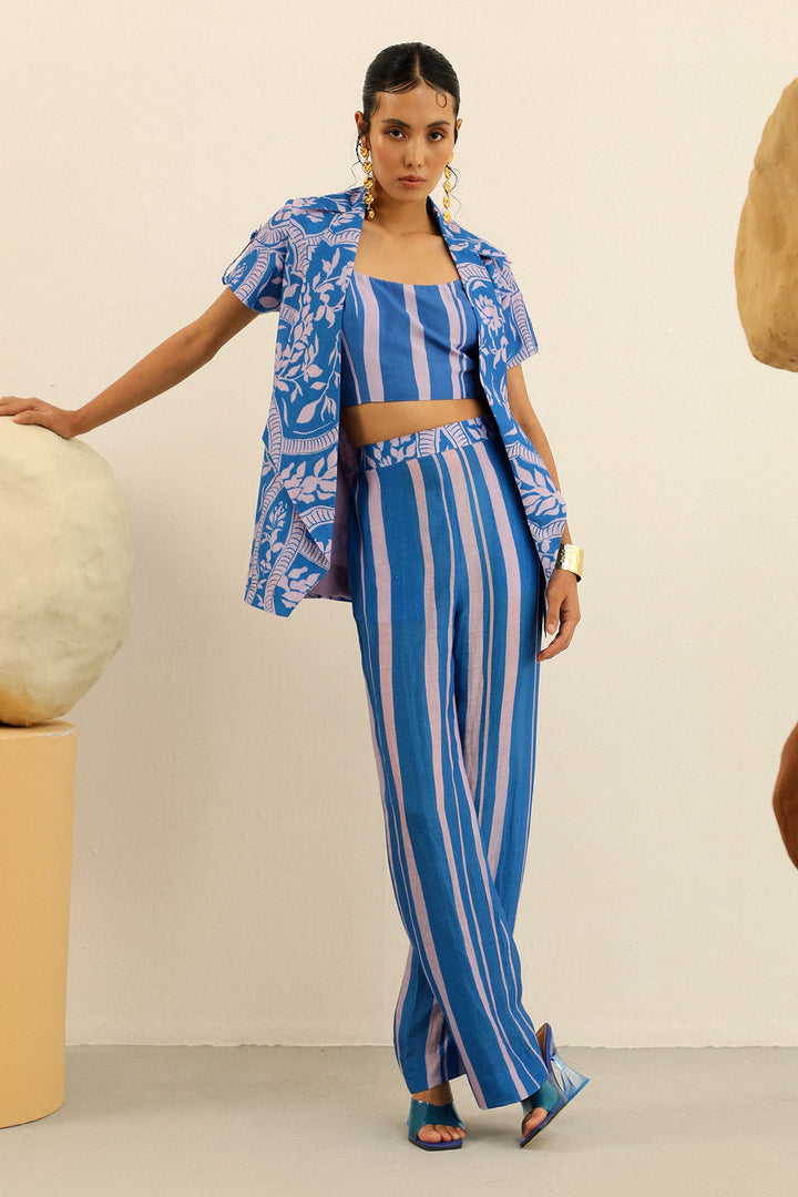 Moonlight handloom linen blazer with all over botanical print & cascade notched collar. Paired with high waisted straight fit trousers with stripe print & round neck crop top.