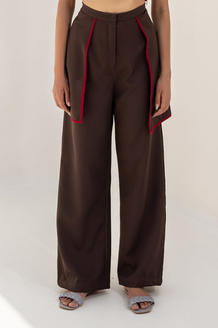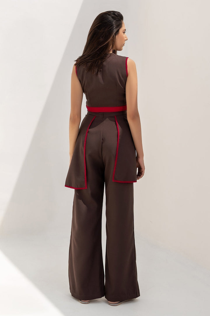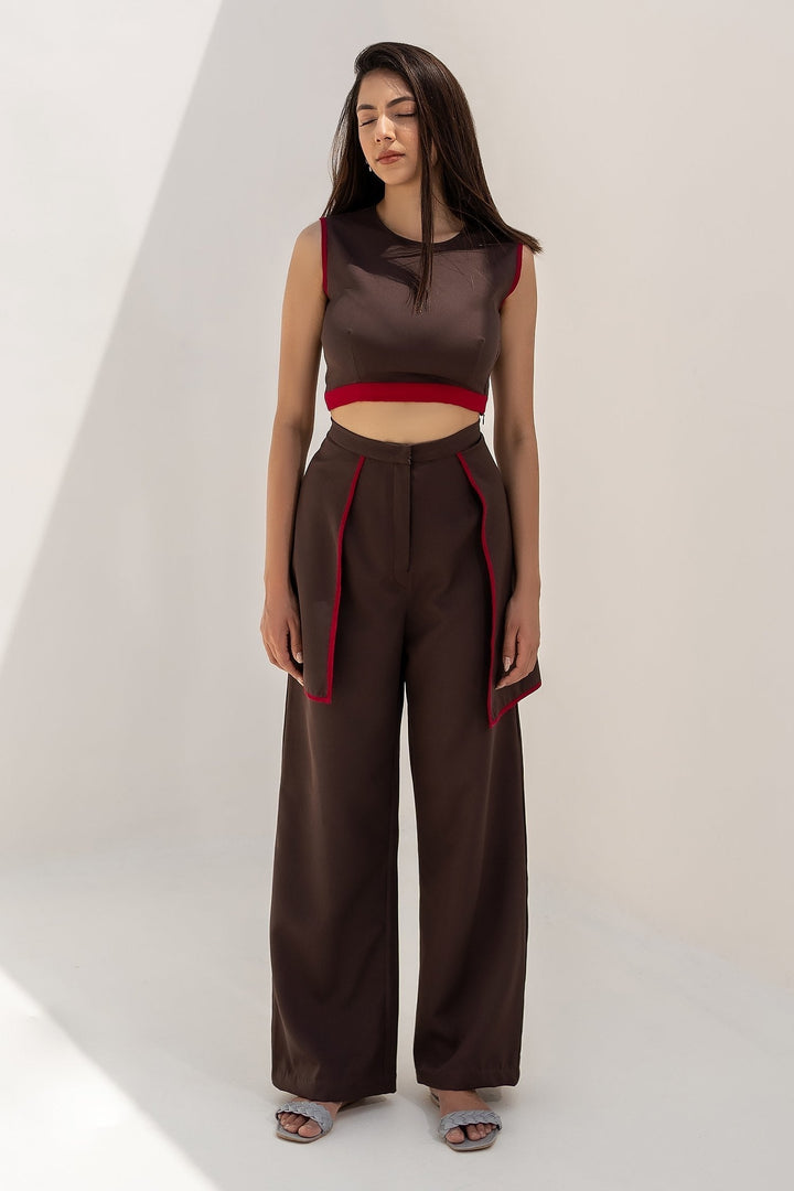 Brown Banana Crepe Round Neck Top And Overlap Pant Set