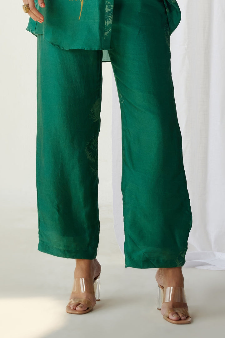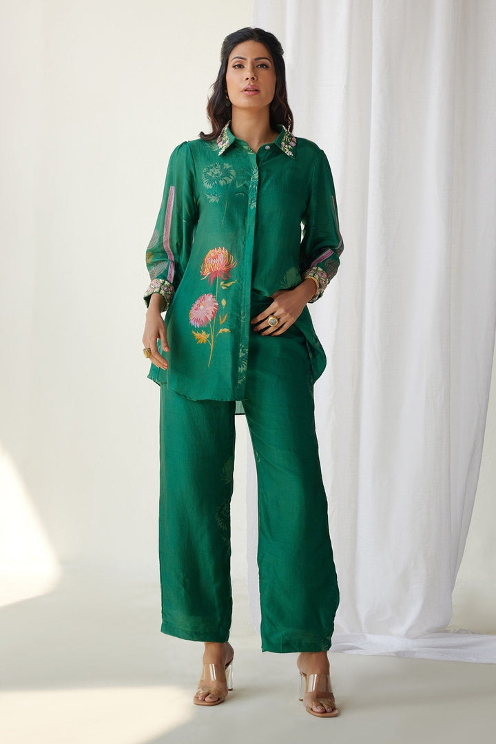 Emerald Green Silk Printed Floral Shirt Collar Pant Set For Women