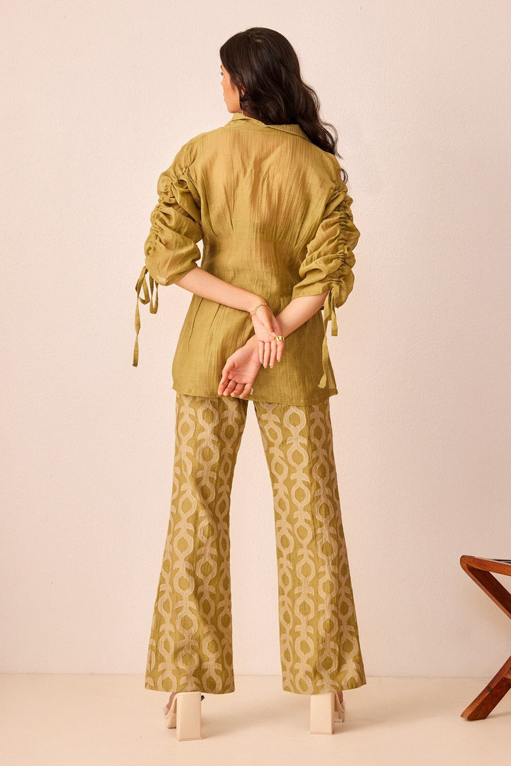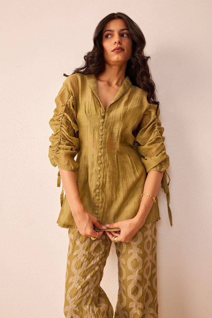 Green Chanderi Silk Embroidered Lapel Collar Mila Top And Pant Set