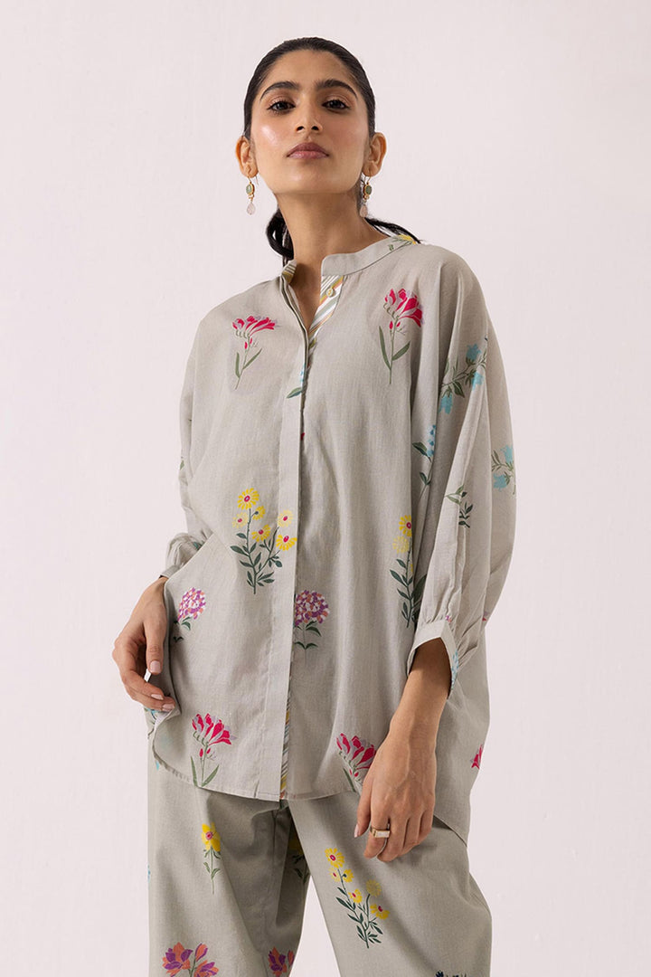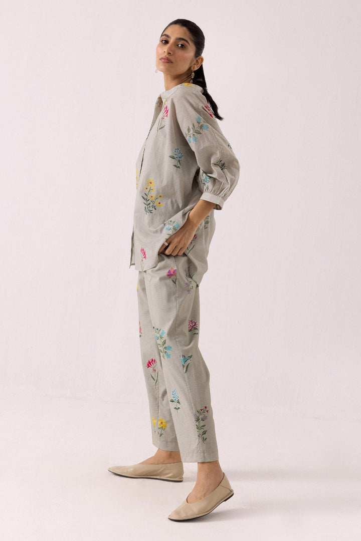 Green cotton shirt with all over floral prints. Paired with coordinating pant.