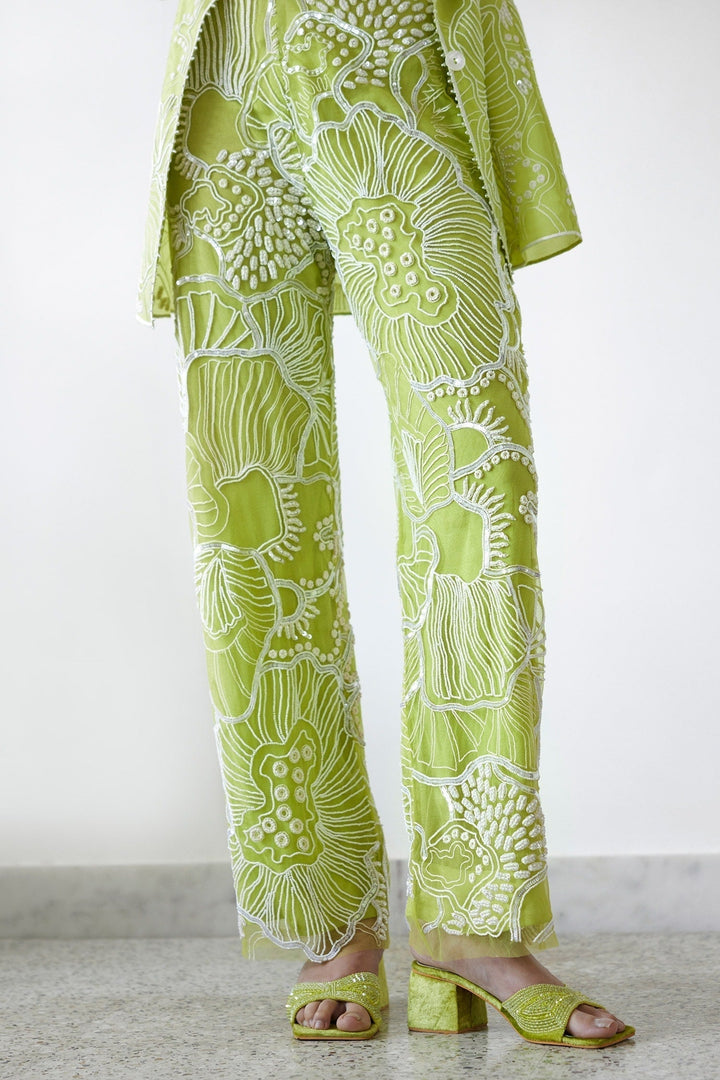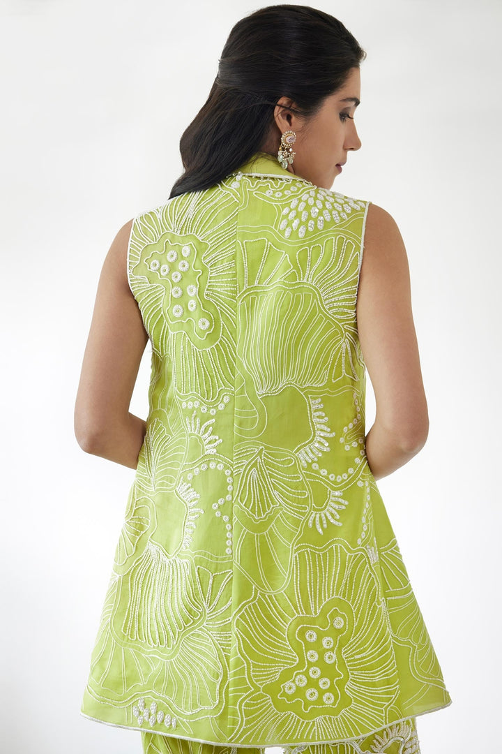 Lime green organza sleeveless blazer with all over sea coral pattern, notched lapel collar, contrast beads & thread embroidery. Paired with embroidered pants & round neck top.