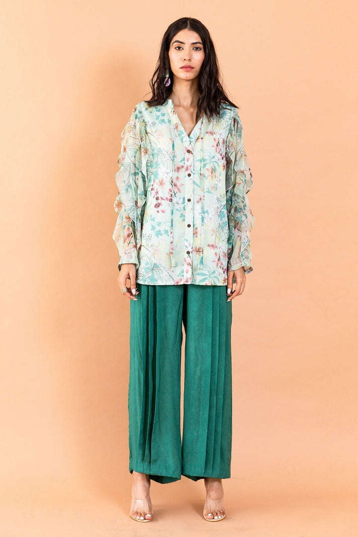 Green Recycled Chiffon Amberlyn Catmint Print Shirt And Pant Set