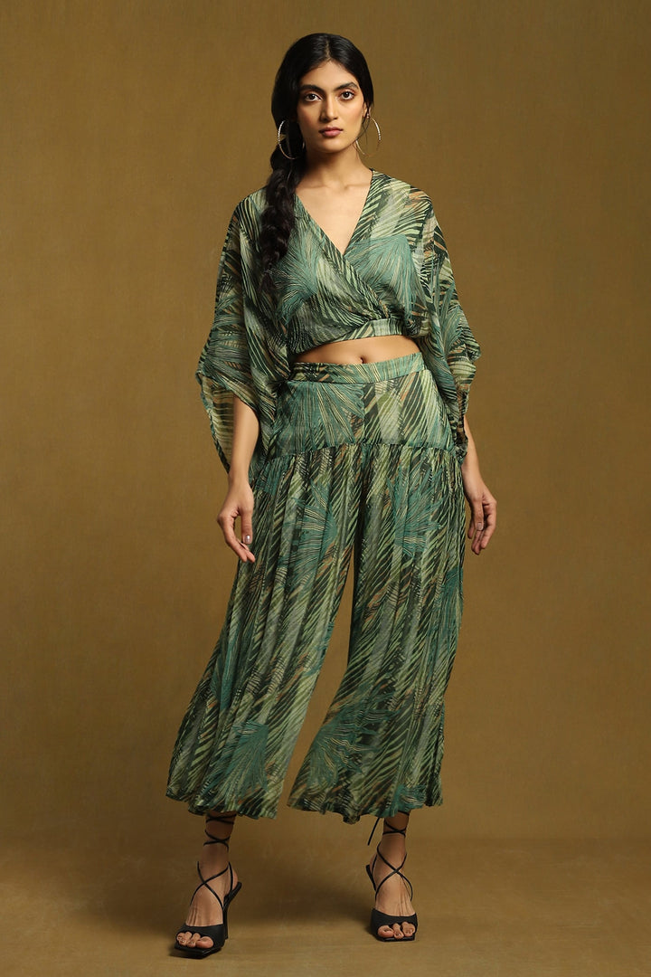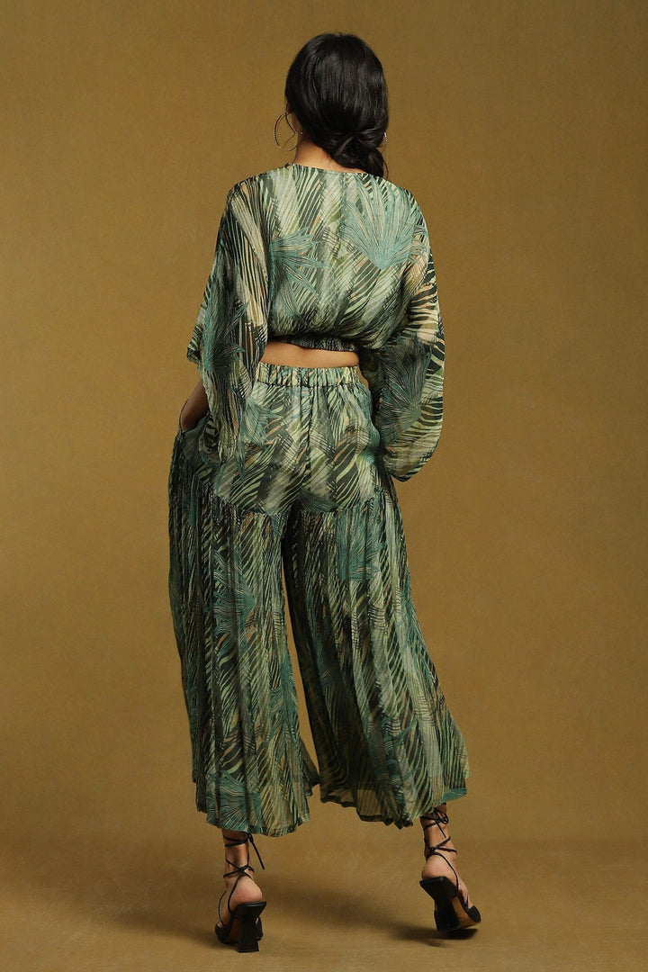 Green Viscose Chiffon Printed Leafy Botanic Top And Palazzo Co-ord Set For Women