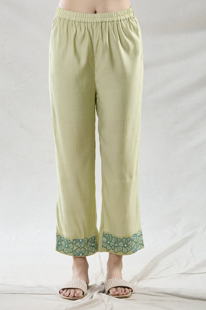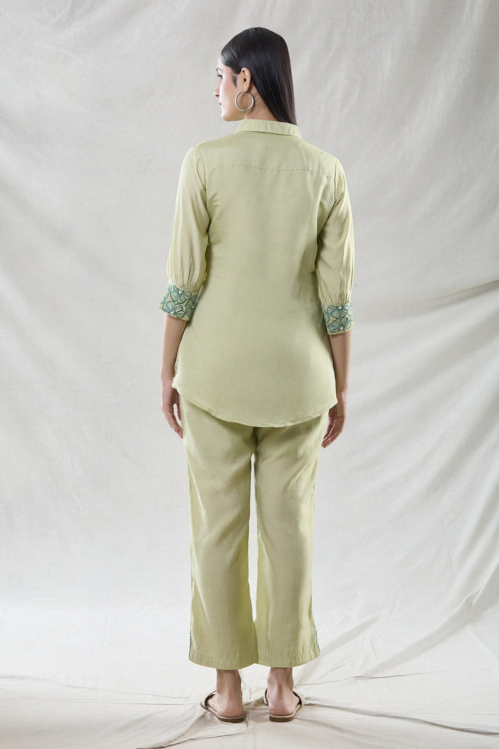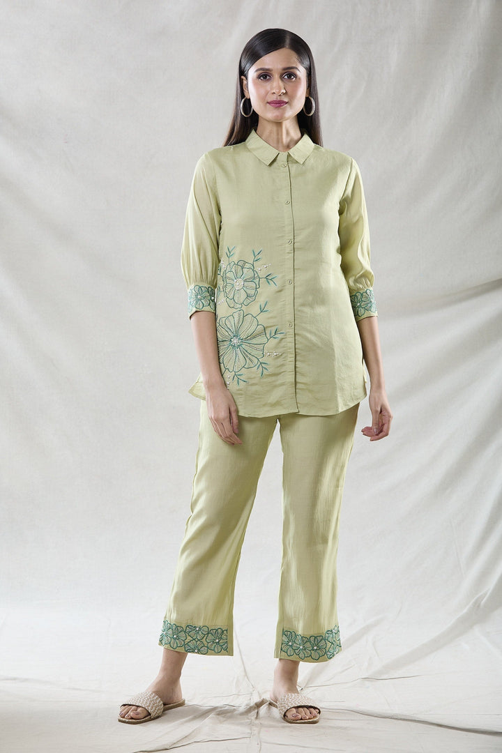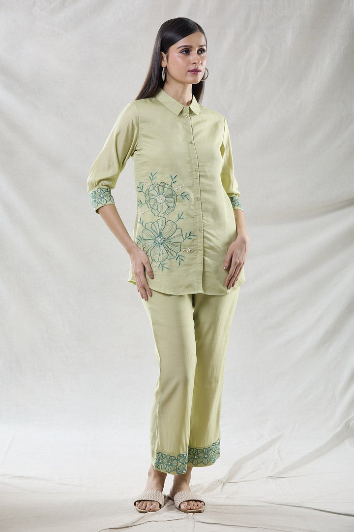 Pista green shirt with floral applique embroidery and applique work cuff sleeves. Paired with a pant.