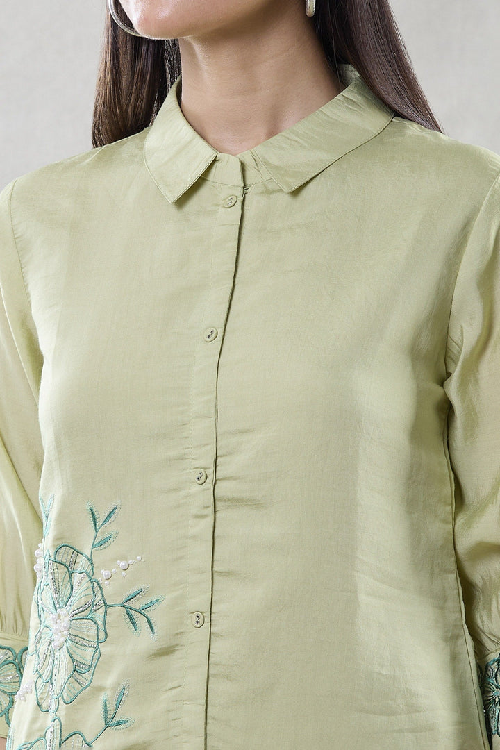 Green Viscose Embroidered Applique Collared Kia Shirt And Pant Set