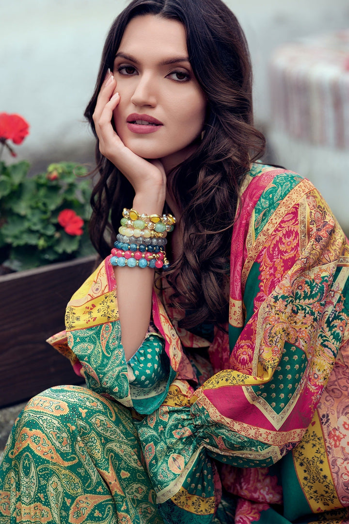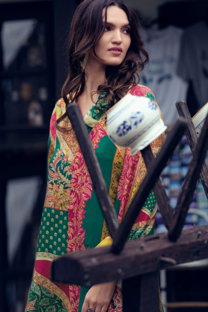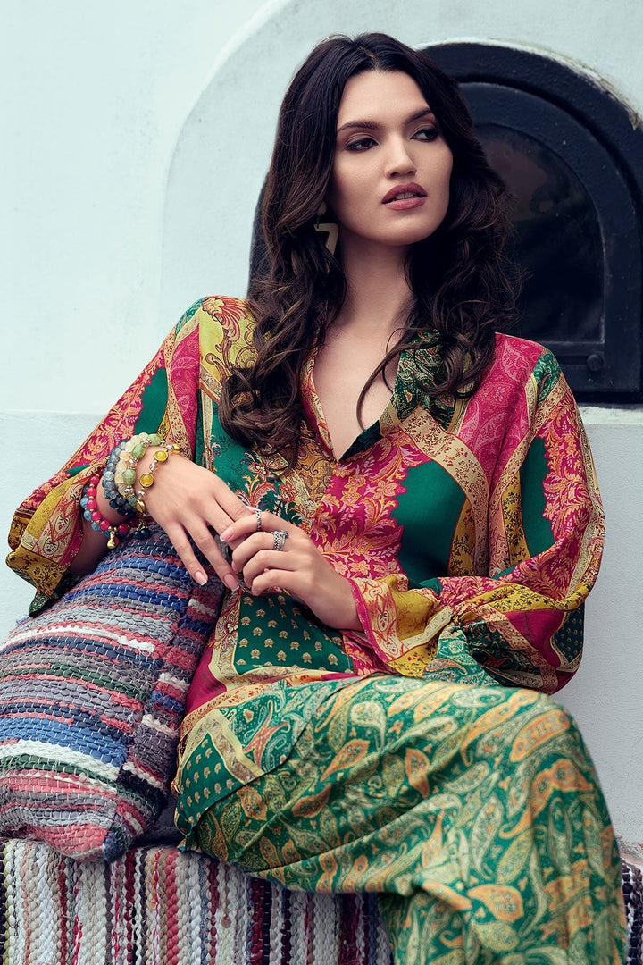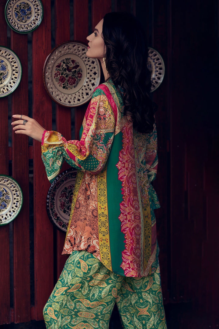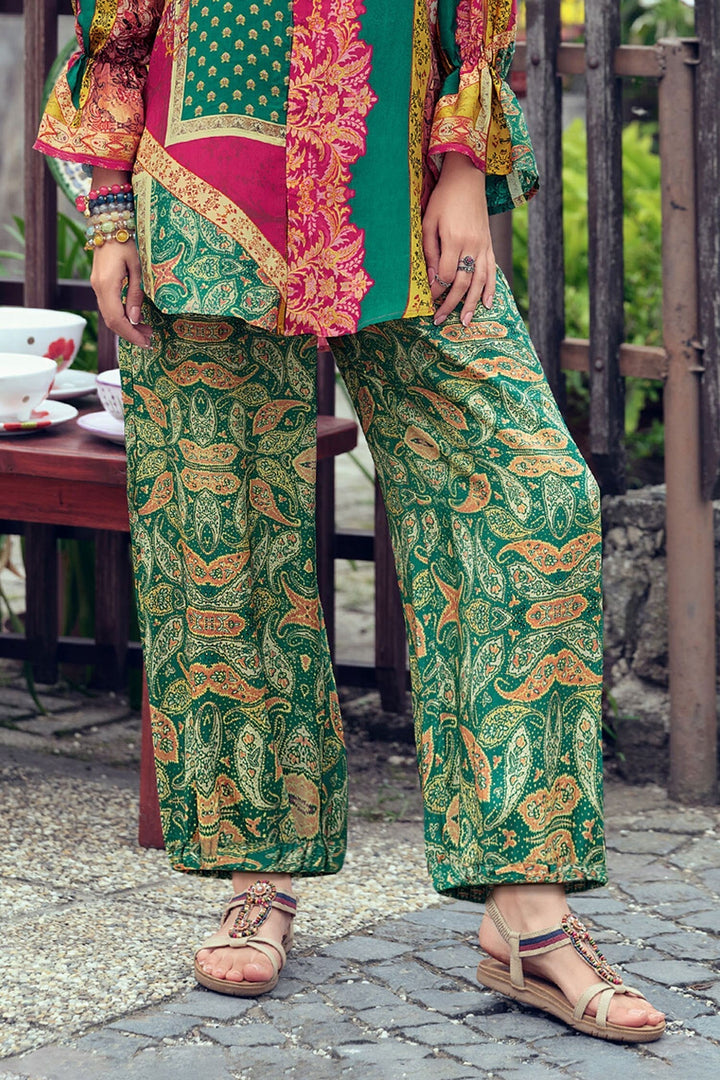 Green viscose woven muslin shirt with floral and leaf printed patchwork. Comes with pant.