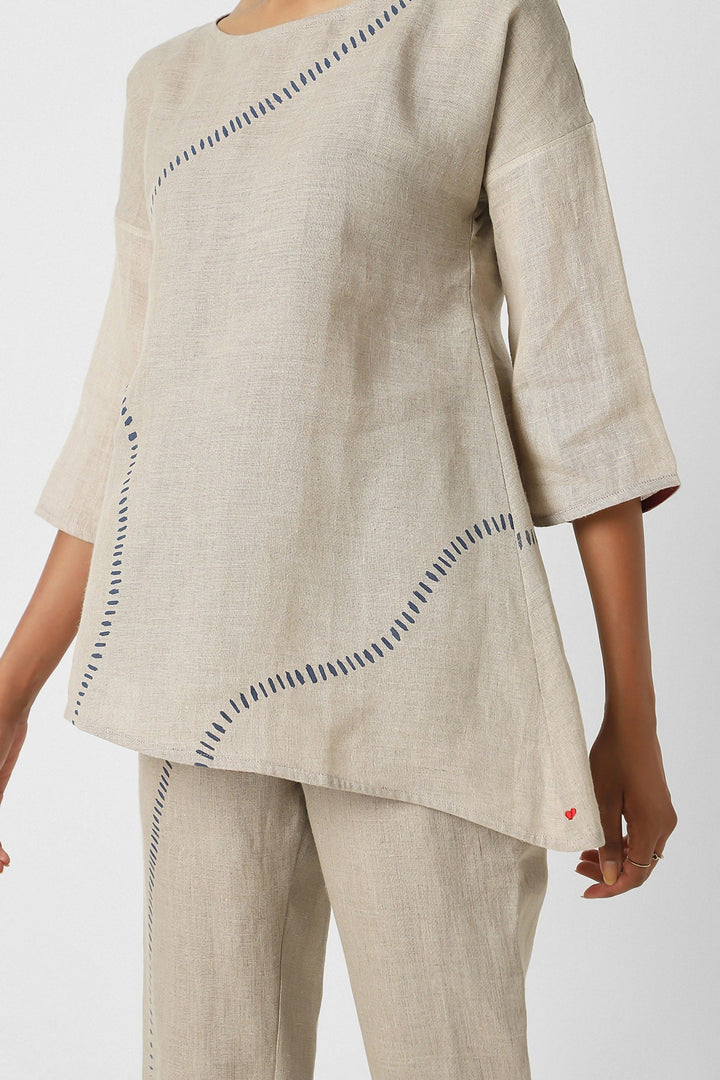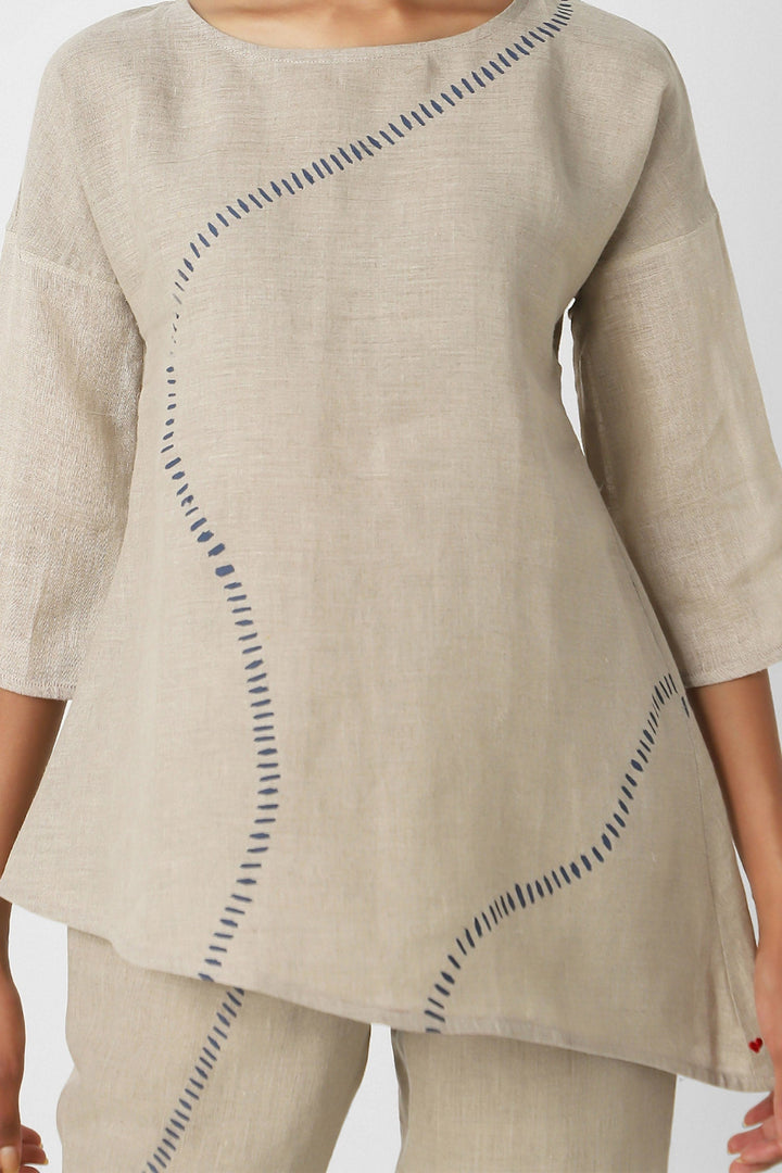 Natural asymmetric top with placement hand screen print. Paired with matching pant.