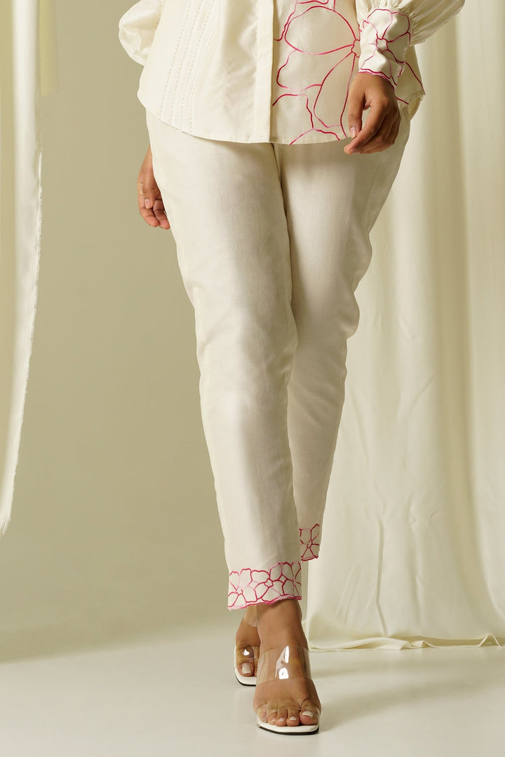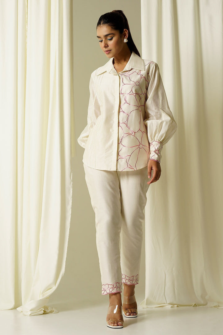Ivory chanderi shirt with magenta thread embroidered flowers on sleeves & half panel and lace detailing. Comes with straight-cut pant.