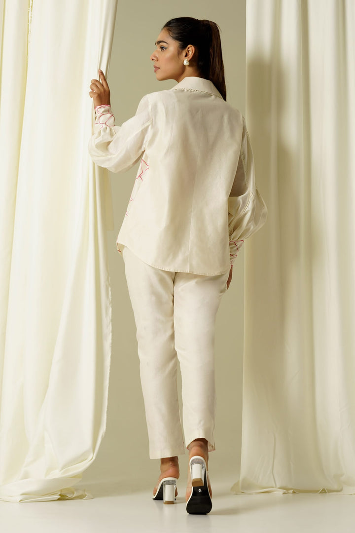 Ivory Chanderi Embroidered Thread Collared Neck Shirt And Pant Set For Women