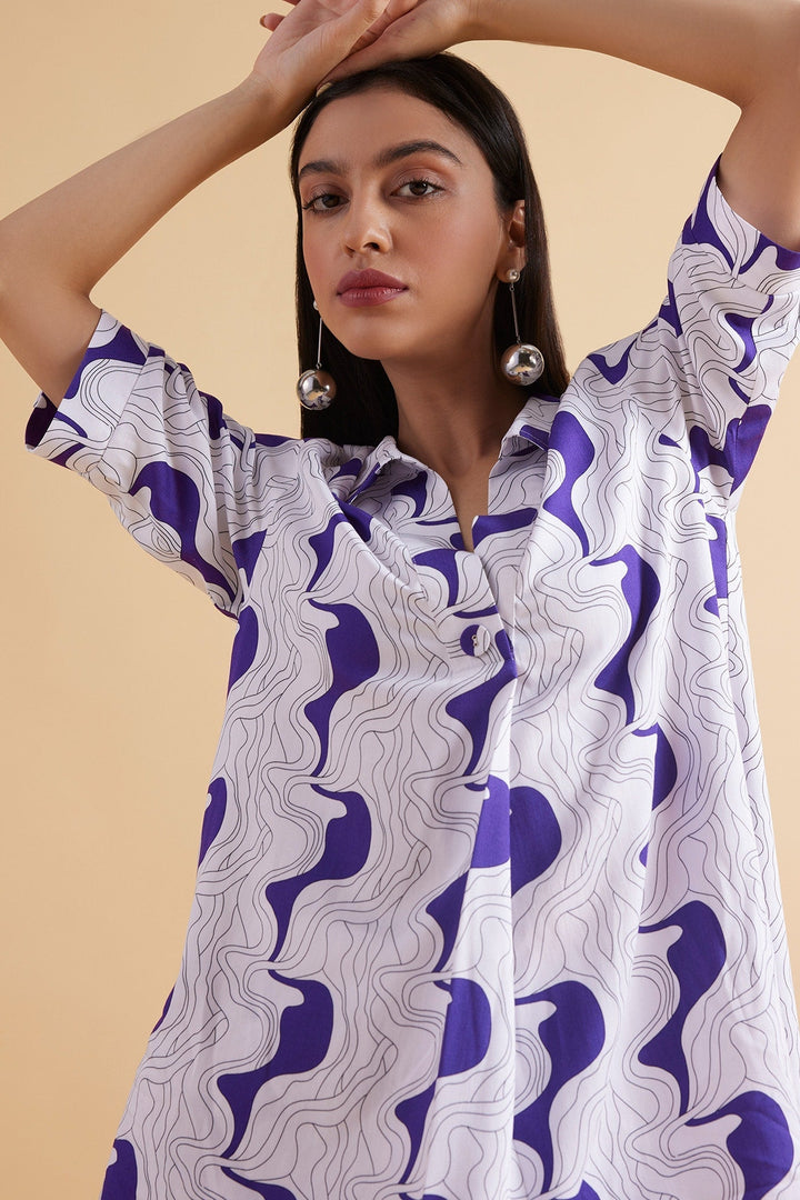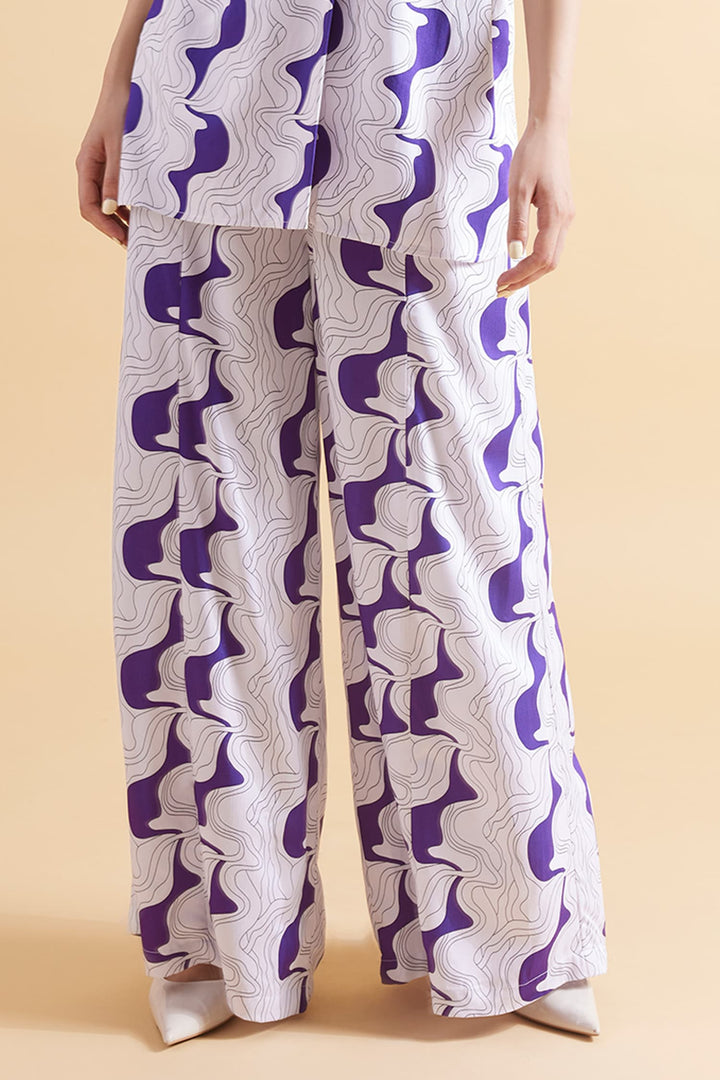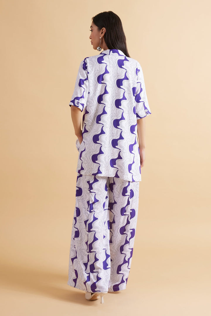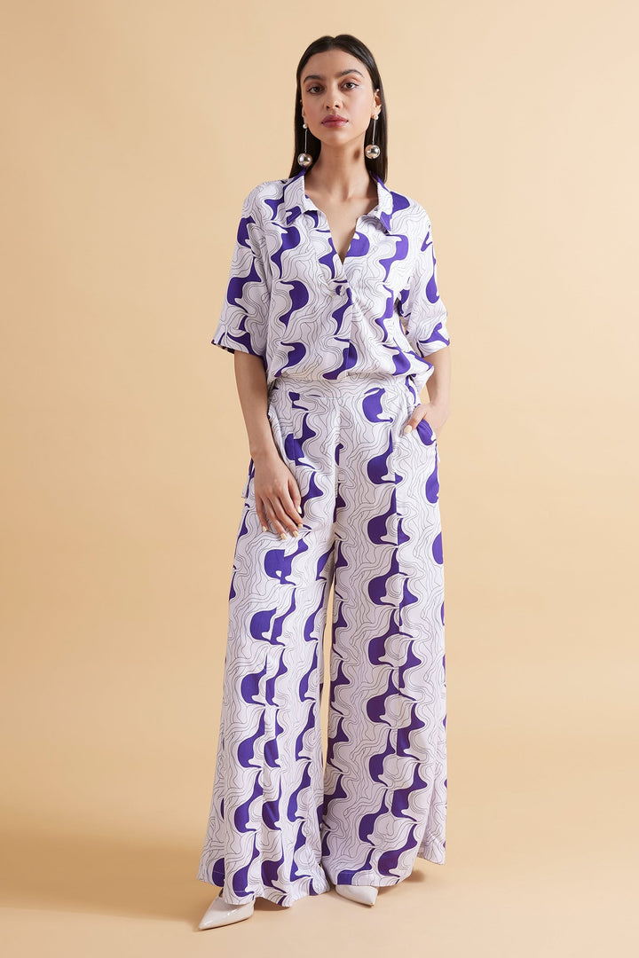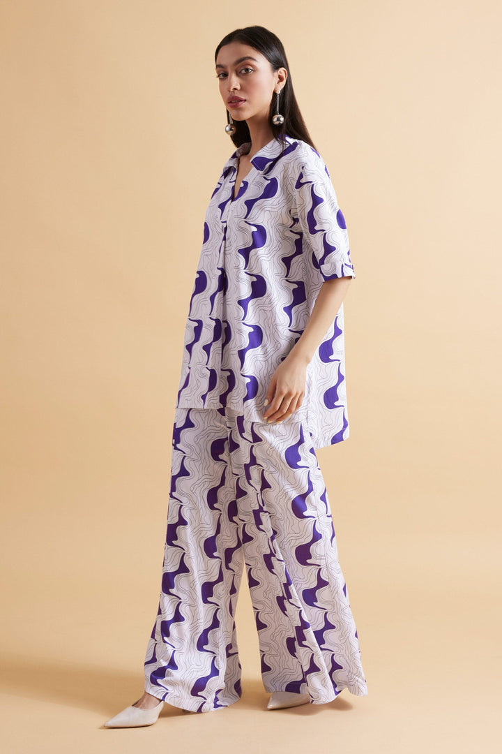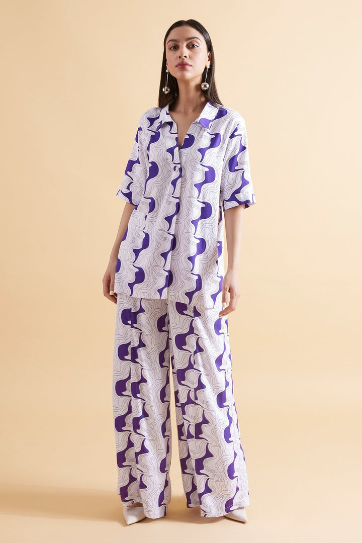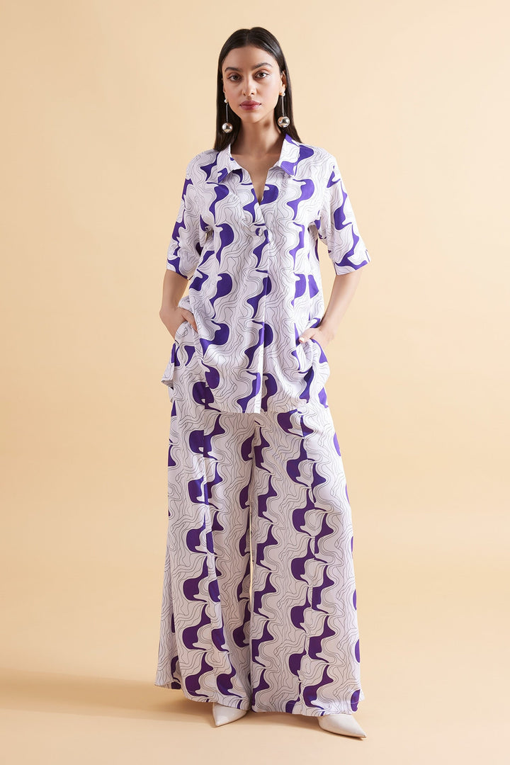 Ivory & berry shirt with all over abstract print & high low hem. Paired with printed wide legged pant with side pockets.