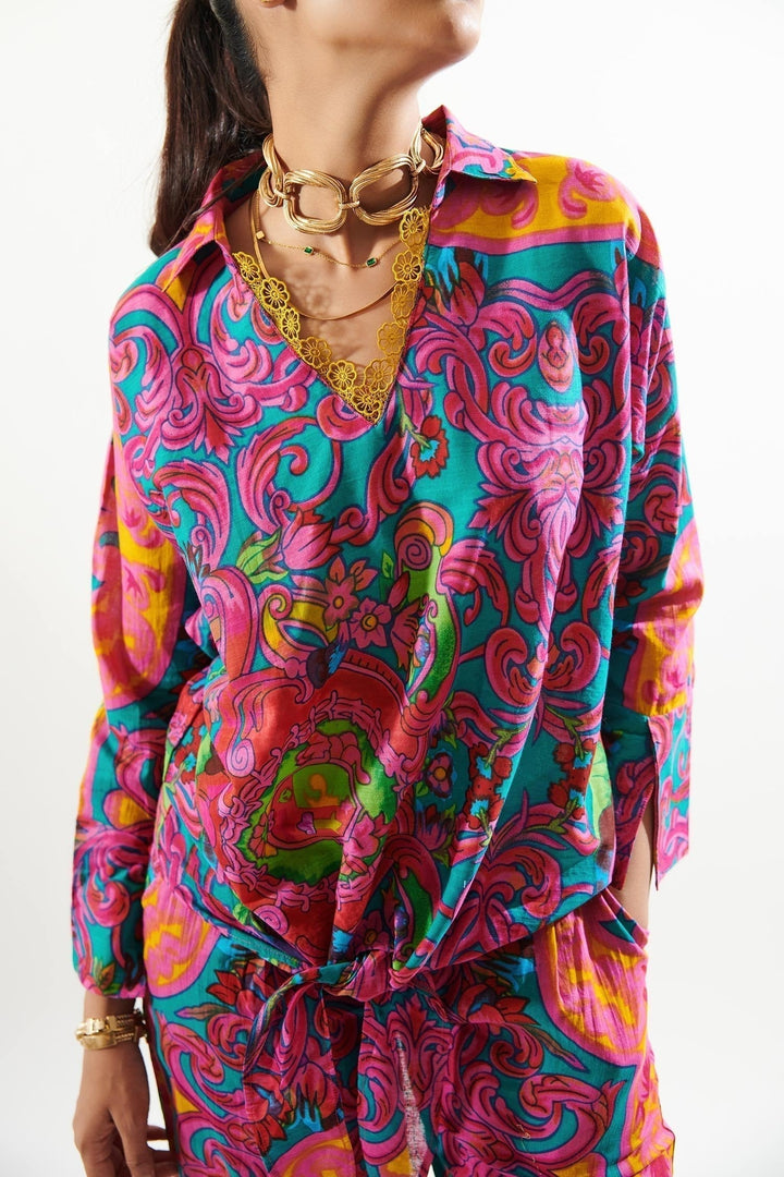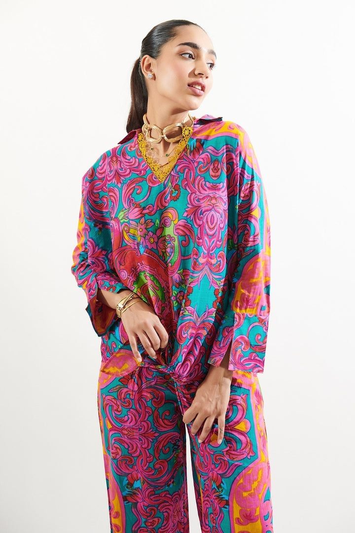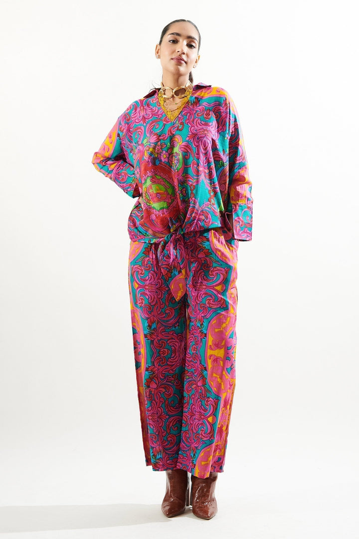 Magenta, pink top with all-over floral print and tie up detail at the front. Comes with co-ordinating pant.