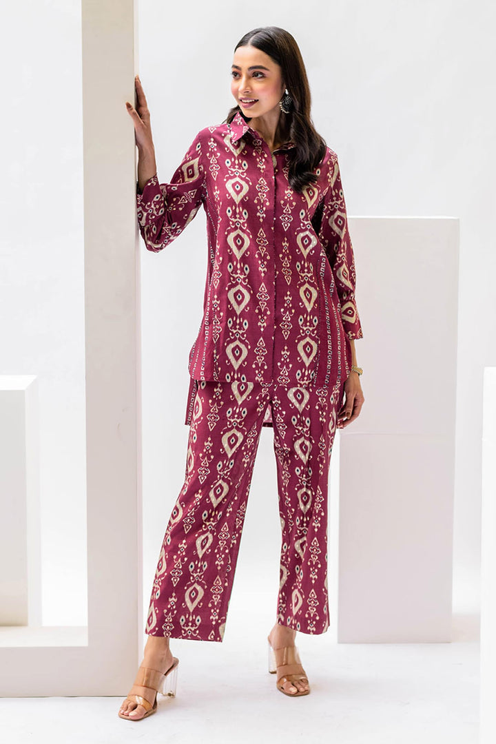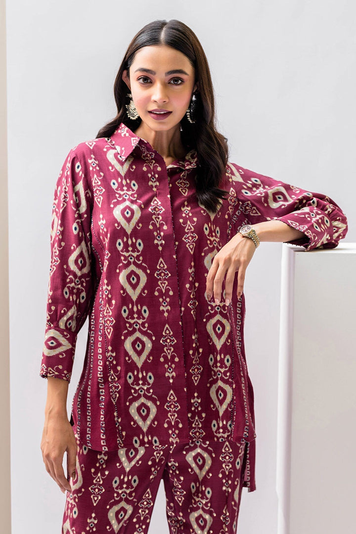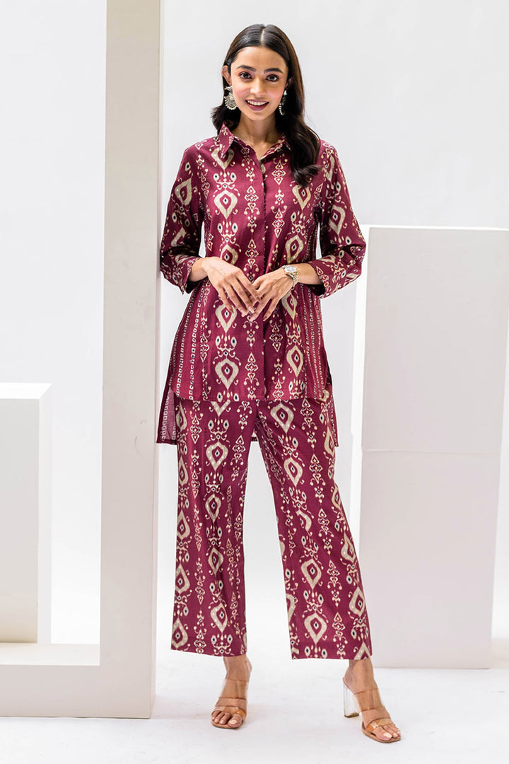 Maroon Cotton Print Ikat Collar Shirt With Pant For Women