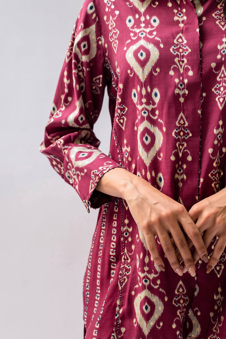 Maroon three fourth sleeves high low shirt with all over ikat print. Paired with matching straight pant.