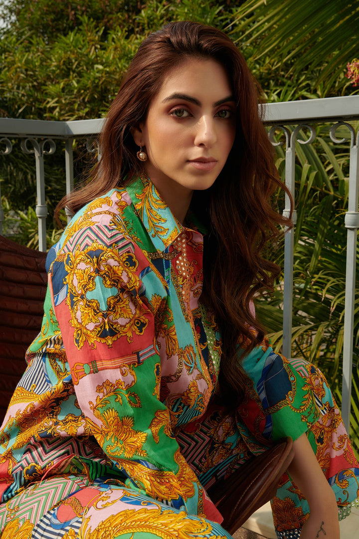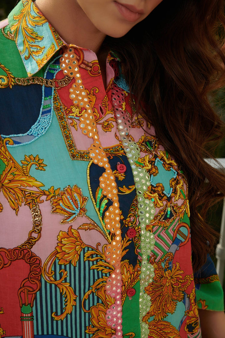 Multicolor abstract ornamental printed shirt dress with mirror lace work placket. Paired with scallop lace hem tapered pant.