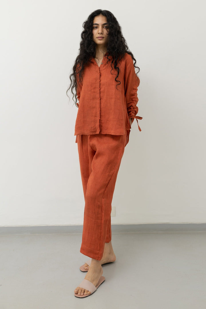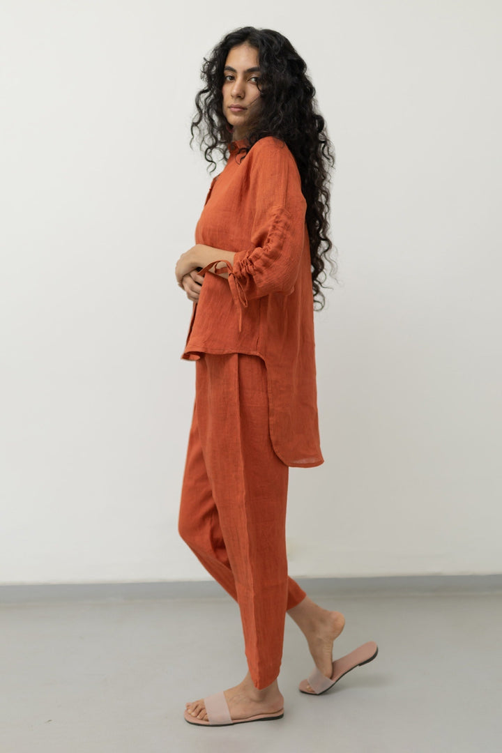 Orange Linen Collar Ruched Tie-up Sleeves Shirt With Pant For Women
