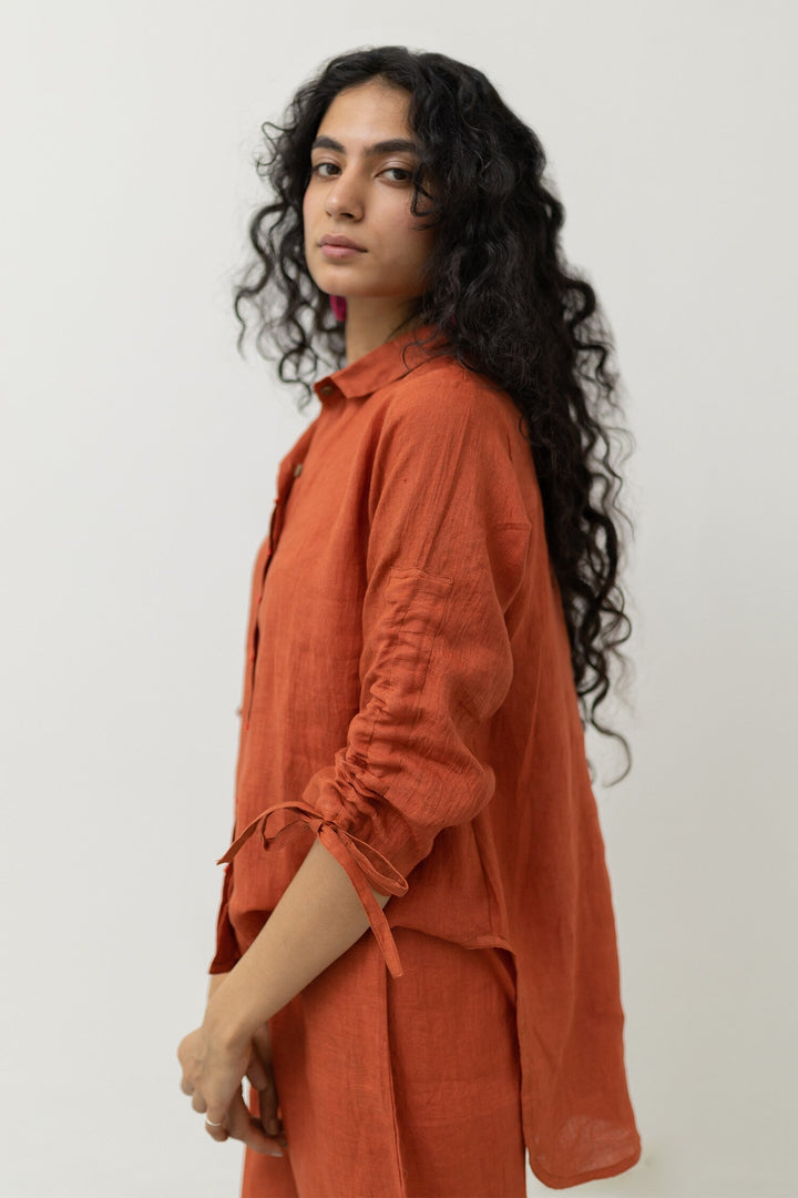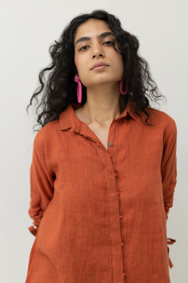 Rust orange three fourth ruched tie-up sleeves shirt with concealed placket, embroidery detail on the placket & back gathers. Paired with matching straight pant.