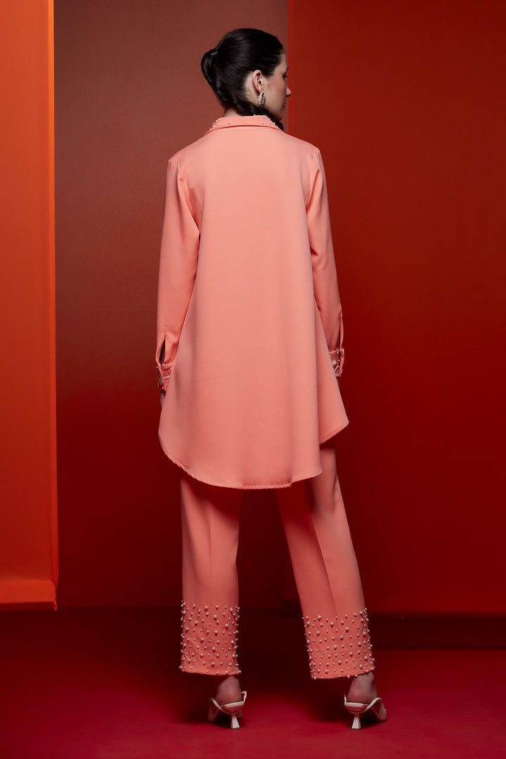 Peach shirt with pearl embellishments on collar and cuffs. Paired with embellished hem pant.