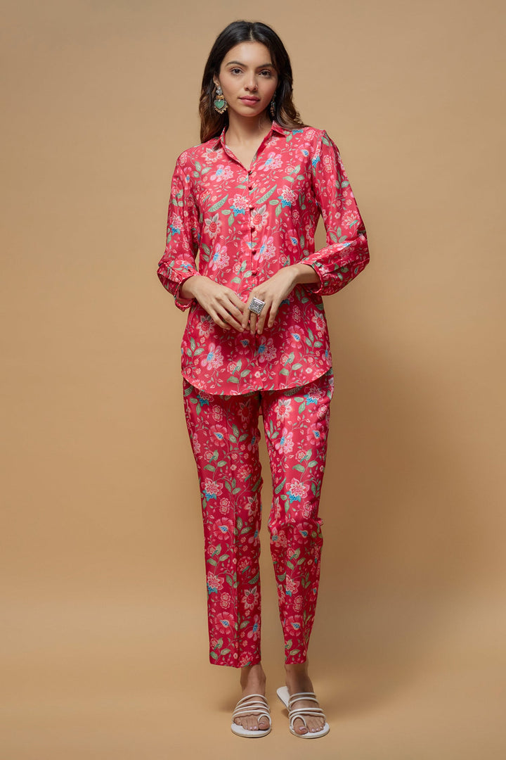 Pink French Crepe Print Floral Collar Neck Shirt With Pant