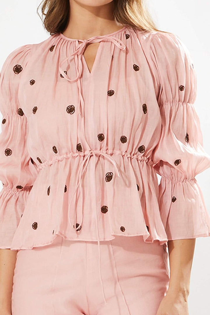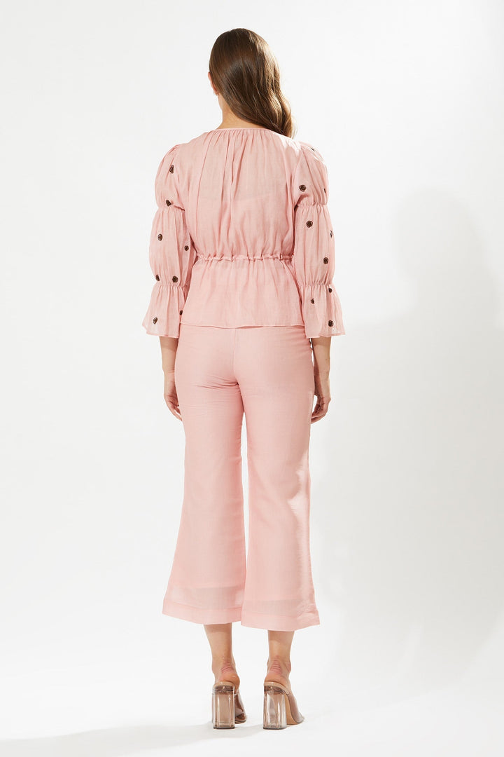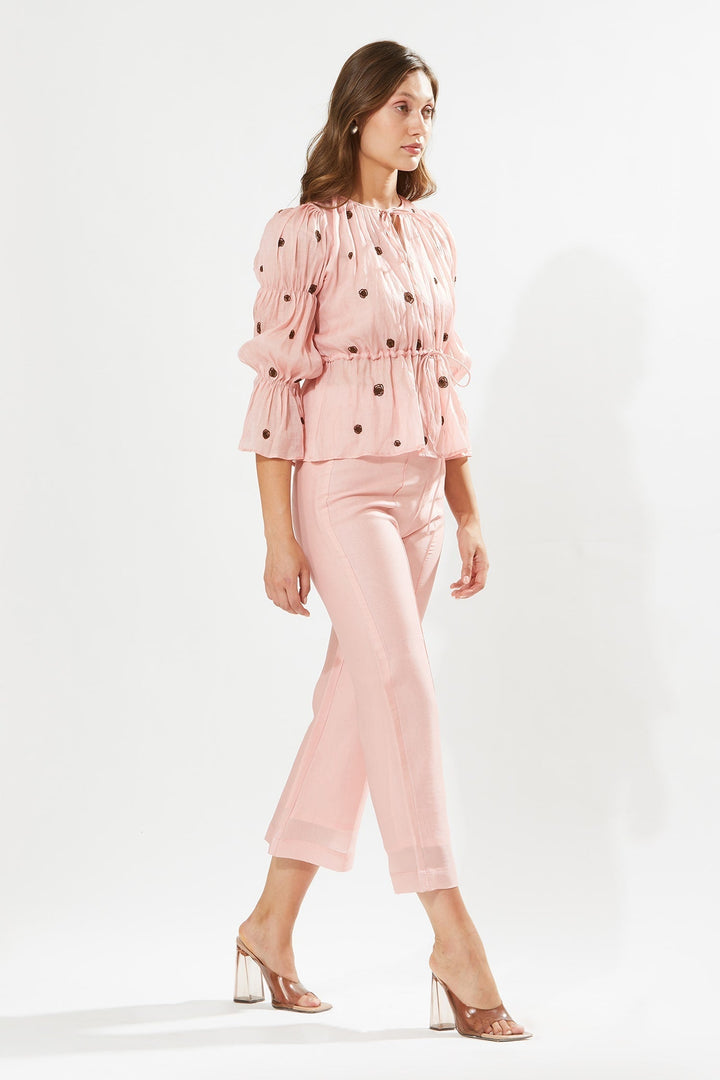 Blush pink top adorned with rosa hand embroidery and self tie detail at the waist. Paired with pant and inner.