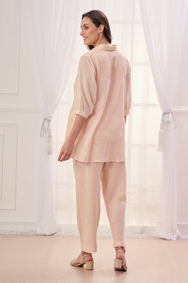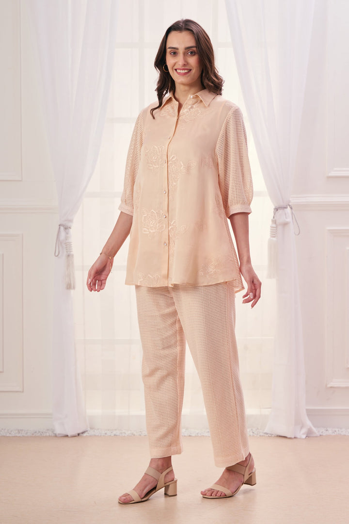 Pink silk cotton blend shirt with floral embroidery. Comes with pant.