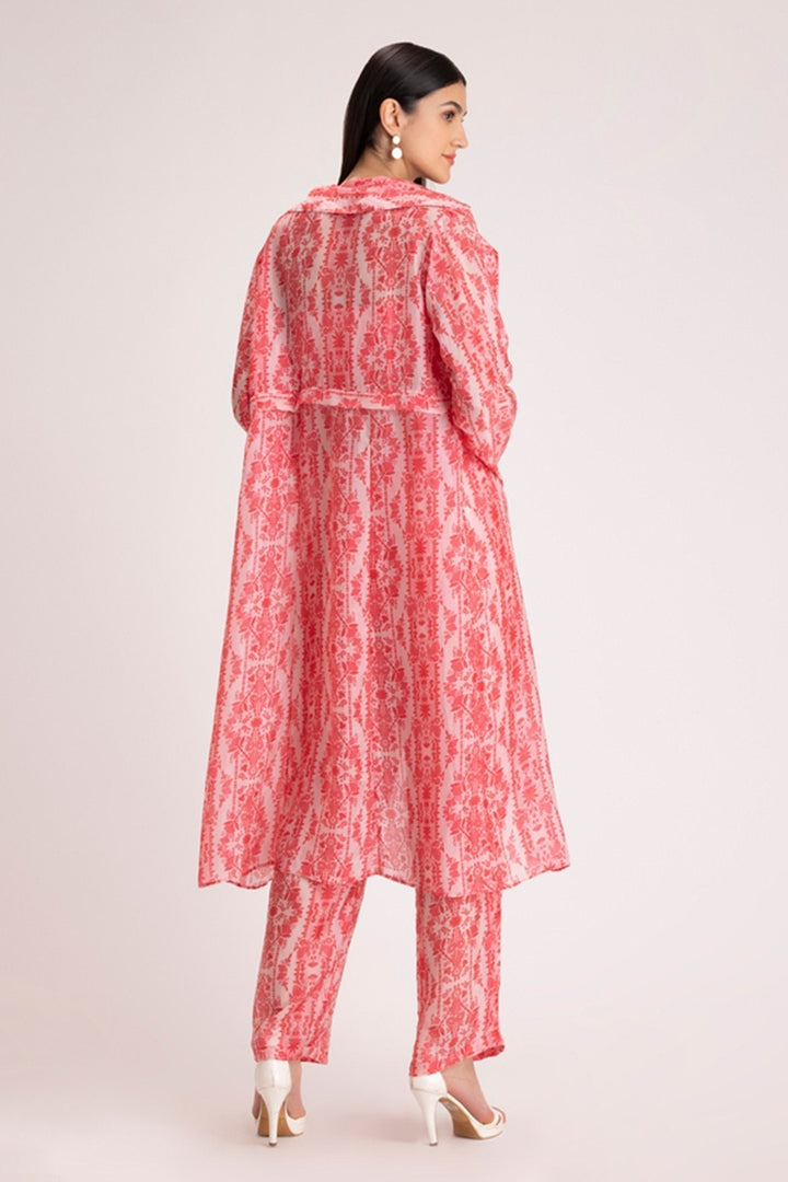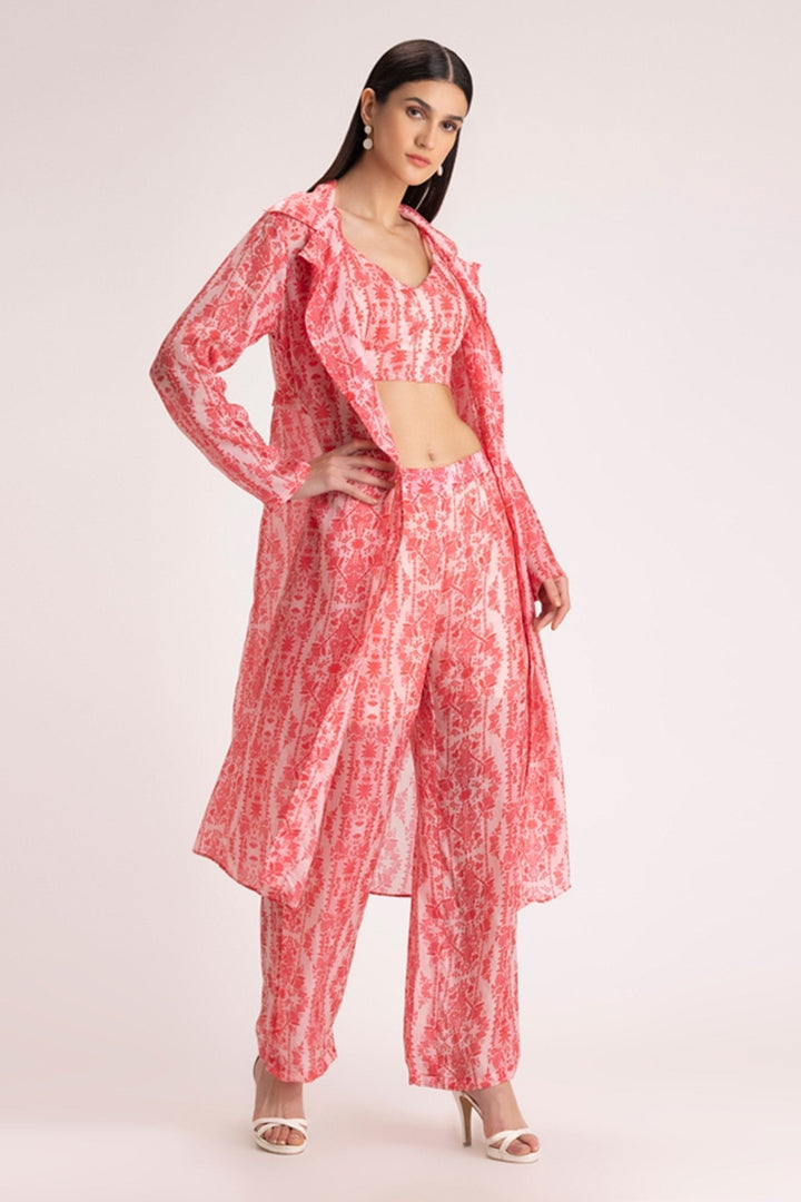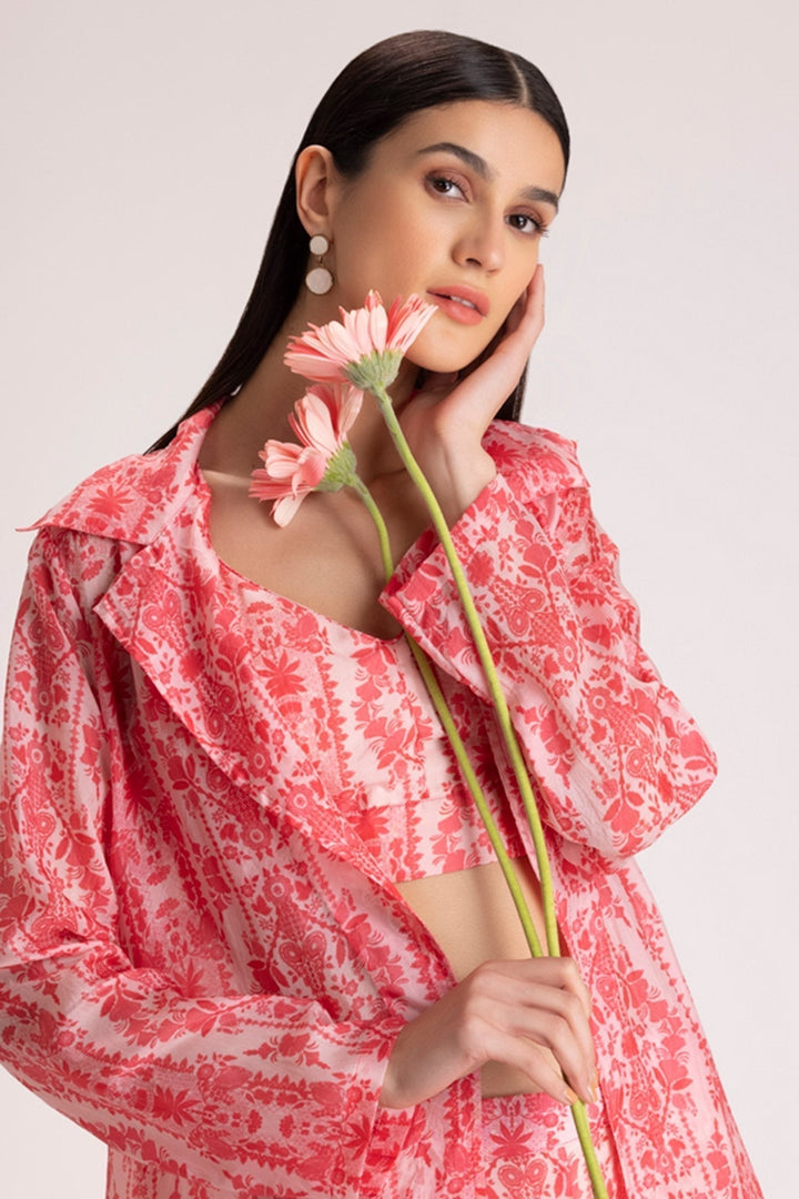 Pink Silk Organza Floral Print Jacket And Pant Set