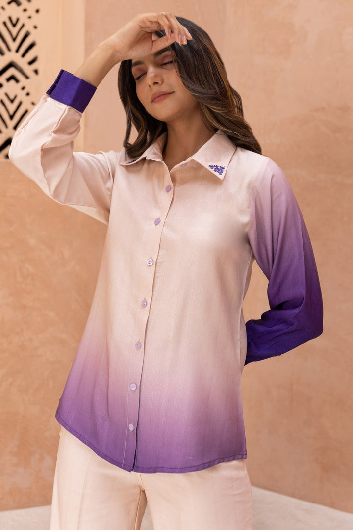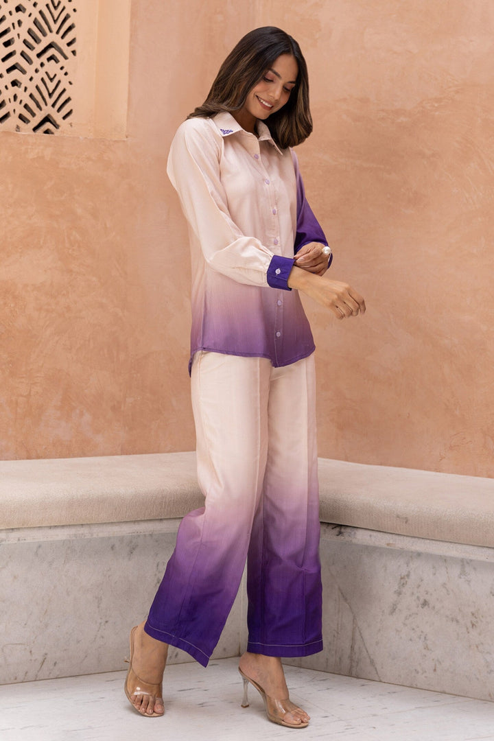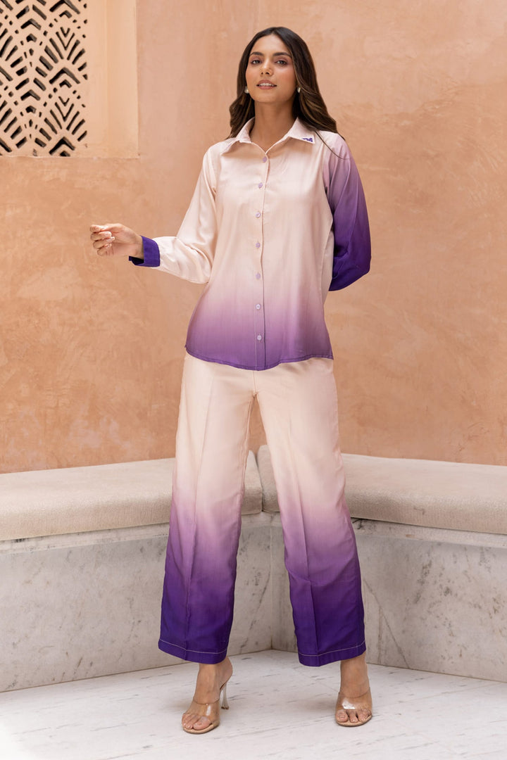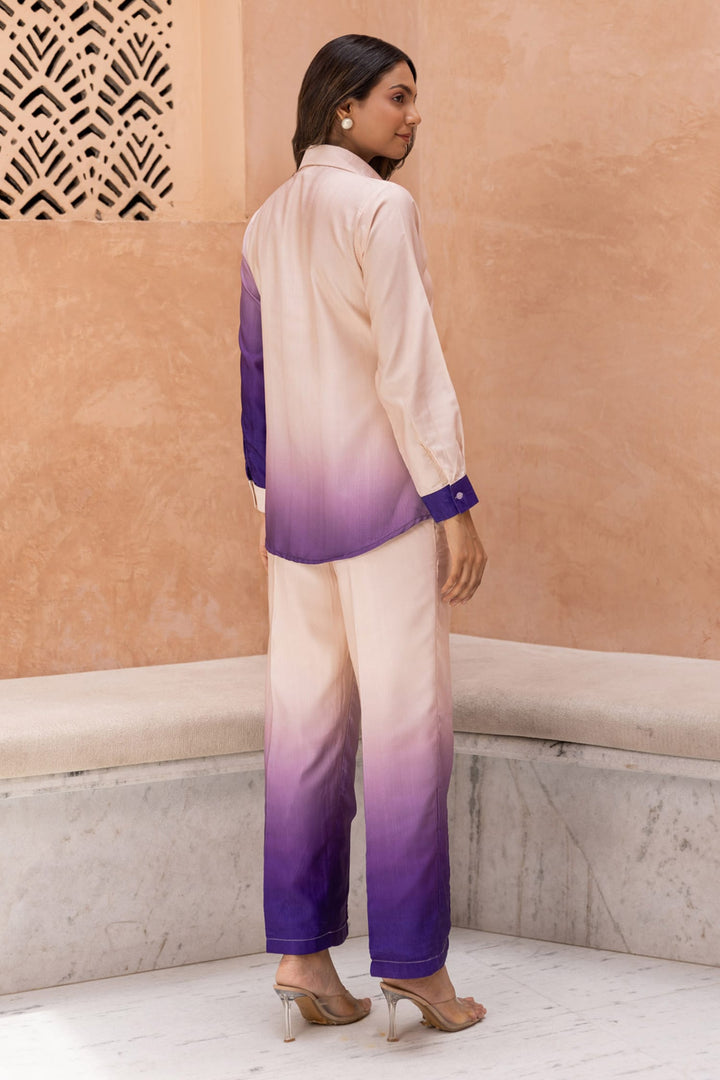 Purple cotton silk ombre effect shirt. Paired with ombre effect pant.