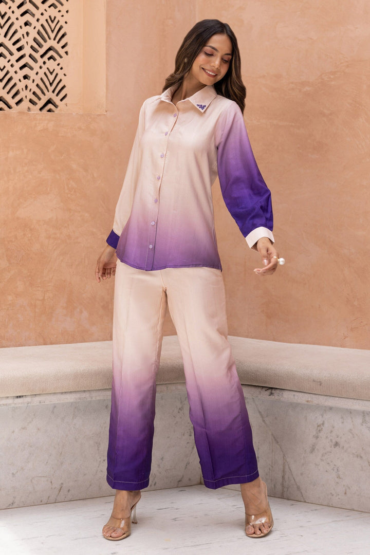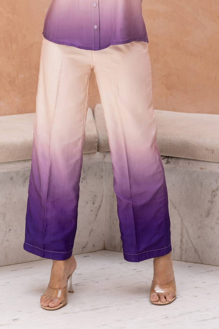 Purple Cotton Silk Plain Collared Iris Ombre Effect Shirt With Trouser For Women