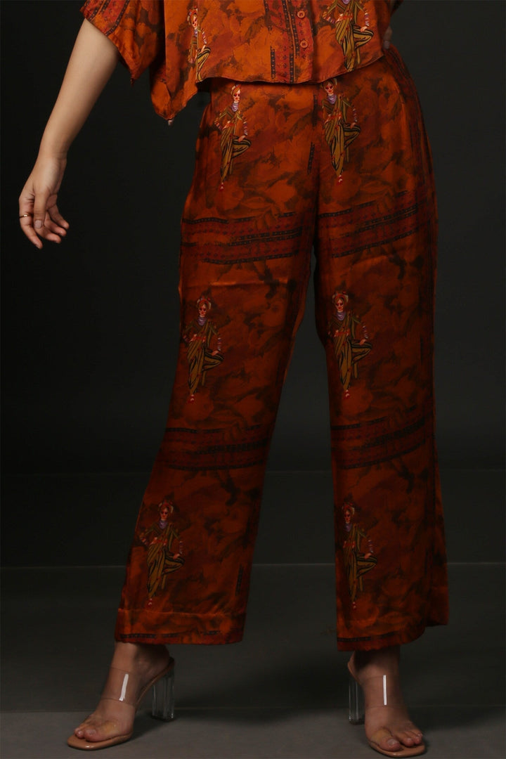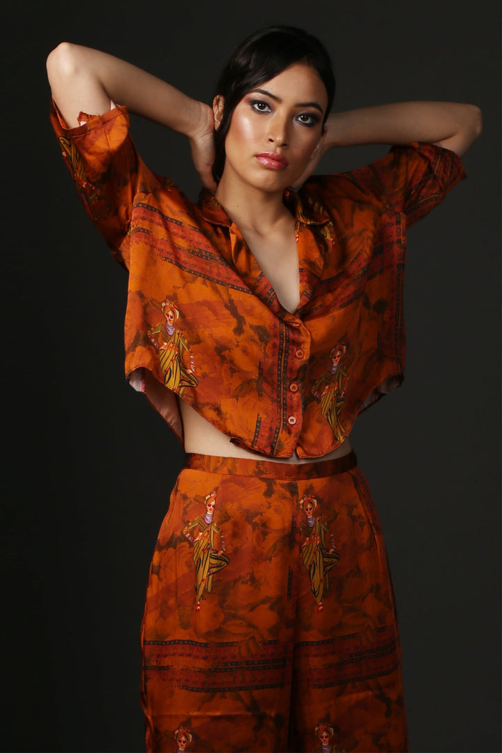 Red resort shirt with kathpulti print and short batwing sleeves. Comes with matching wide leg pant.