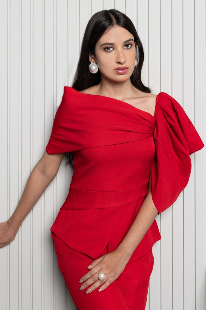 Red Crepe Scarlet Asymmetric Top And Trouser Set