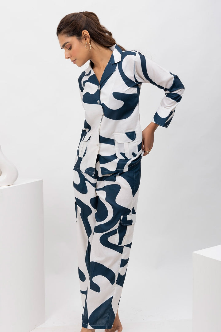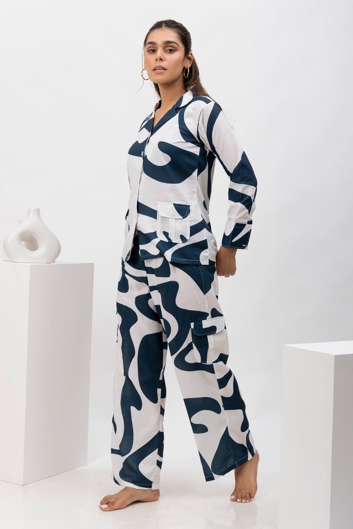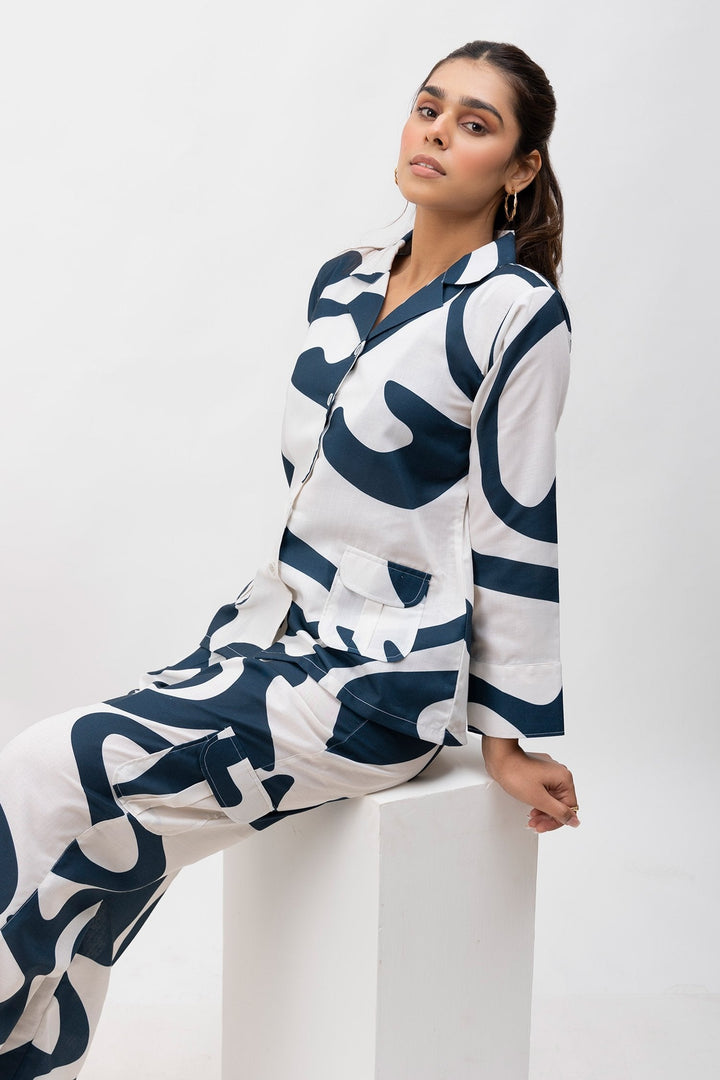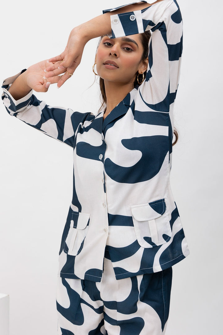 White Cotton Dazzling Maze Print Shirt And Pyjama Set