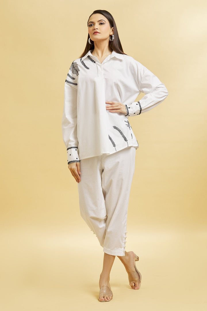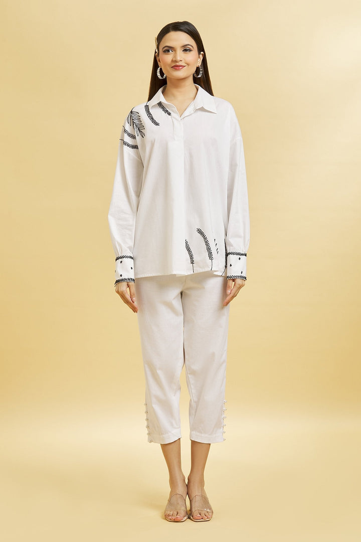 White Cotton Glass Beads Embroidered Shirt And Cigarette Pant Set