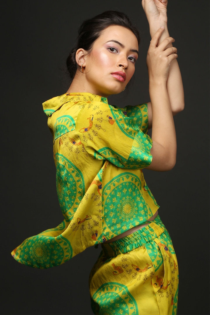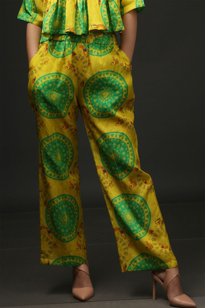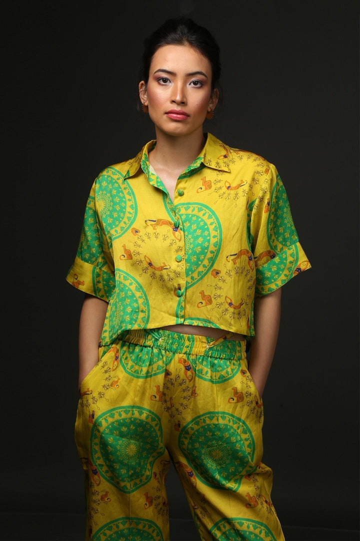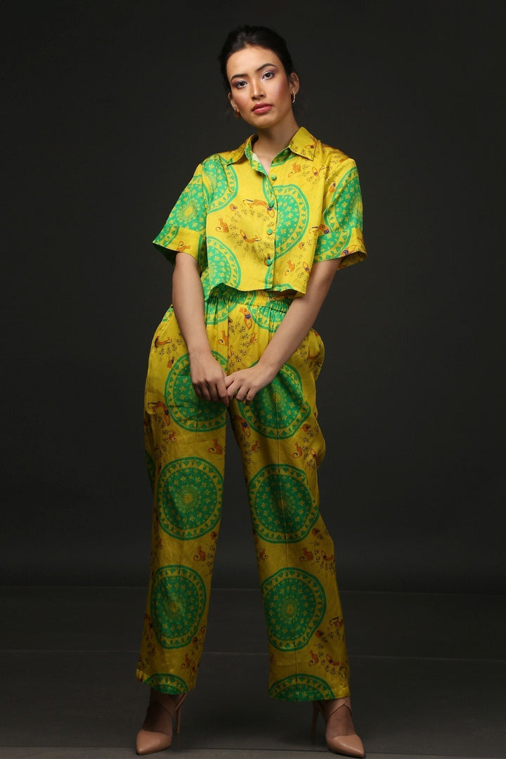 Yellow Cotton City Cat Print Resort Shirt And Pant Set