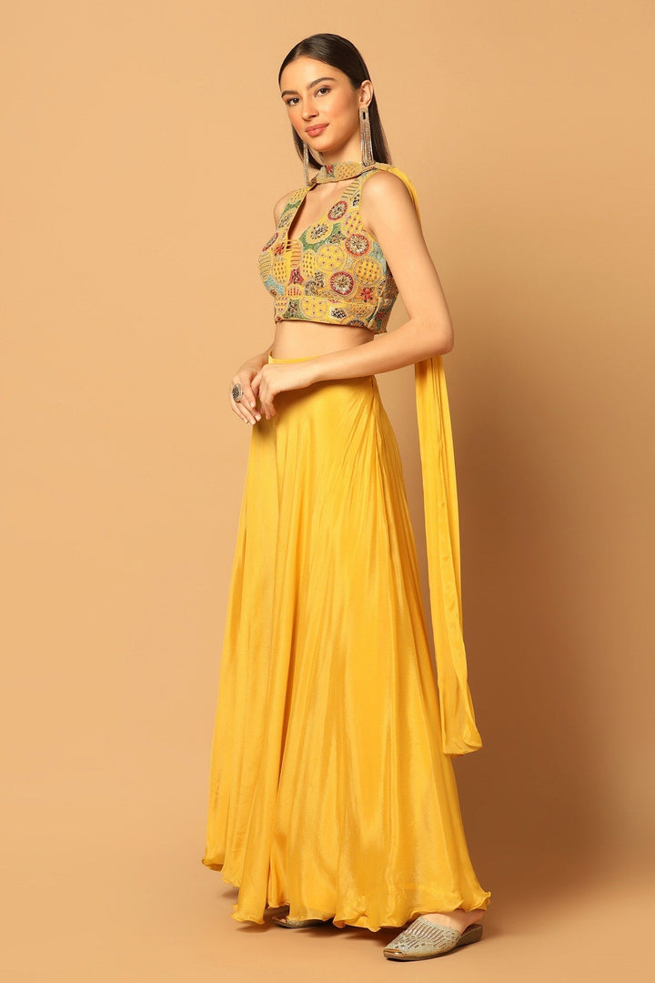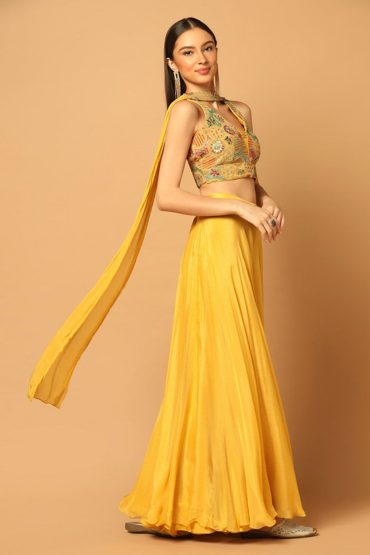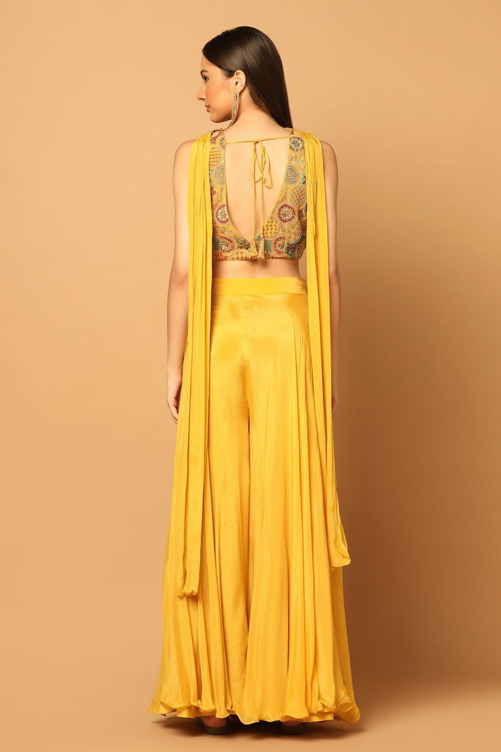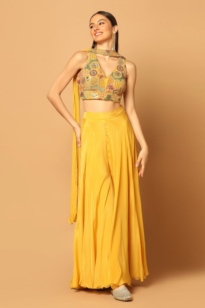 Mustard sleeveless blouse embroidered with dori, multicolor resham threads and scattered sequin work in a geometric pattern. Comes with solid flared palazzo and an embroidered choker dupatta.