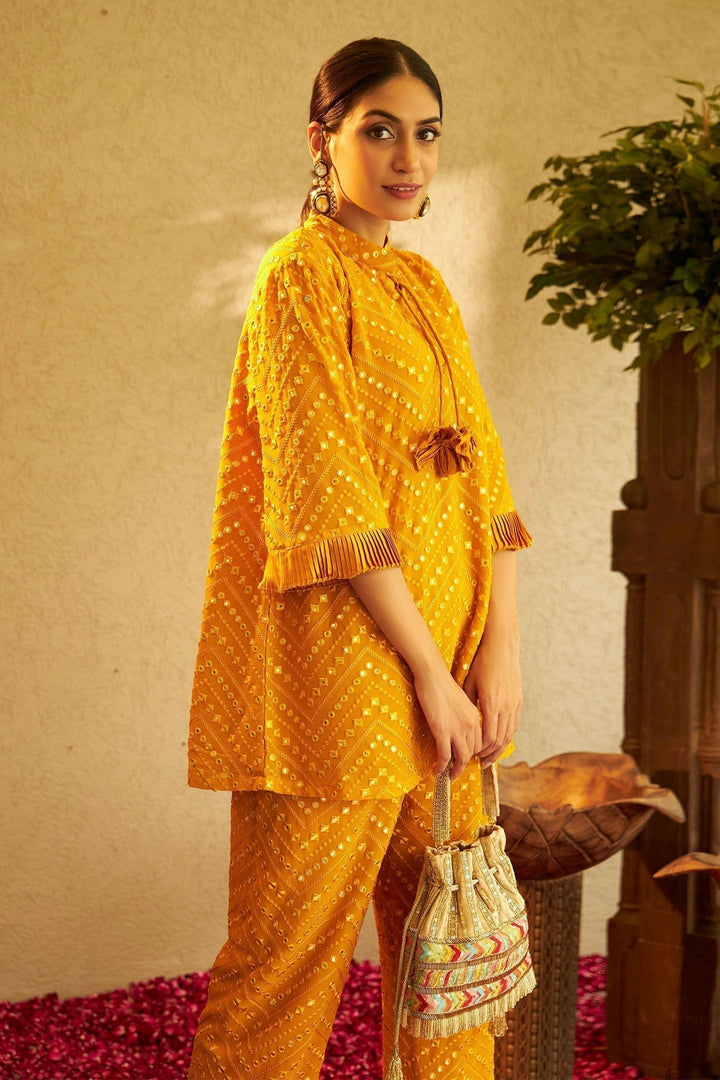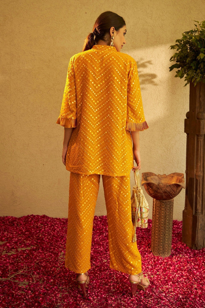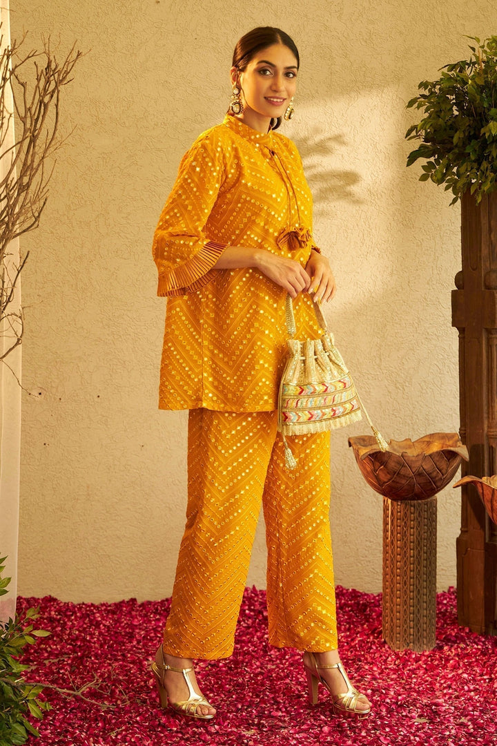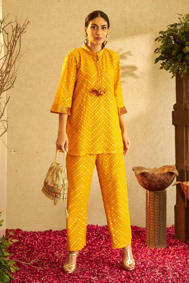 Yellow Pleated Myra Embroidered Top And Pant Set